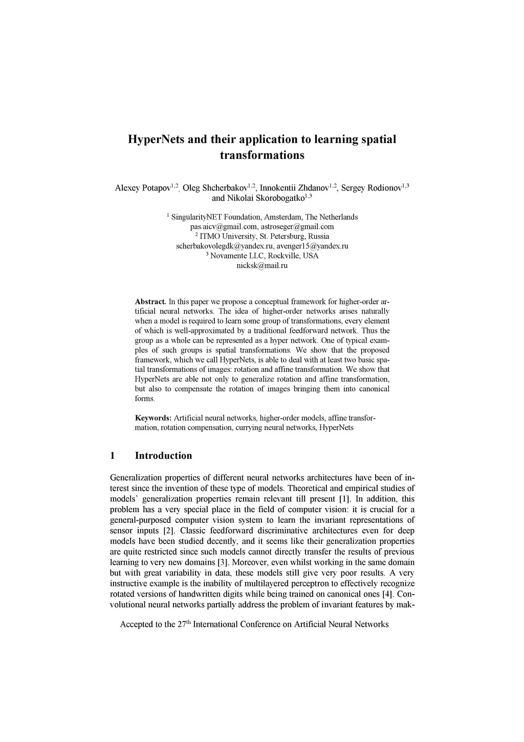 In this paper we propose a conceptual framework for higher-order artificial neural networks. The idea of higher-order networks arises naturally when a model is required to learn some group of transformations, every element of which is well-approximated by a traditional feedforward network. Thus the group as a whole can be represented as a hyper network. One of typical examples of such groups is spatial transformations. We show that the proposed framework, which we call HyperNets, is able to deal with at least two basic spatial transformations of images: rotation and affine transformation. We show that HyperNets are able not only to generalize rotation and affine transformation, but also to compensate the rotation of images bringing them into canonical forms.