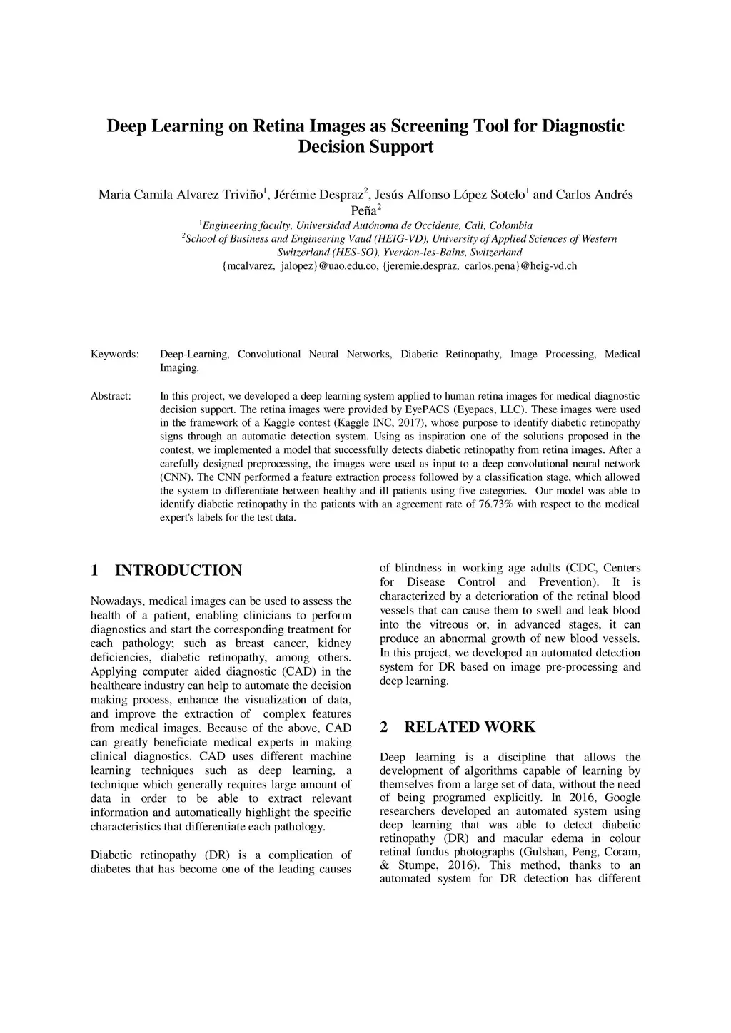 In this project, we developed a deep learning system applied to human retina images for medical diagnostic decision support. The retina images were provided by EyePACS. These images were used in the framework of a Kaggle contest, whose purpose to identify diabetic retinopathy signs through an automatic detection system. Using as inspiration one of the solutions proposed in the contest, we implemented a model that successfully detects diabetic retinopathy from retina images. After a carefully designed preprocessing, the images were used as input to a deep convolutional neural network (CNN). The CNN performed a feature extraction process followed by a classification stage, which allowed the system to differentiate between healthy and ill patients using five categories. Our model was able to identify diabetic retinopathy in the patients with an agreement rate of 76.73% with respect to the medical expert's labels for the test data.