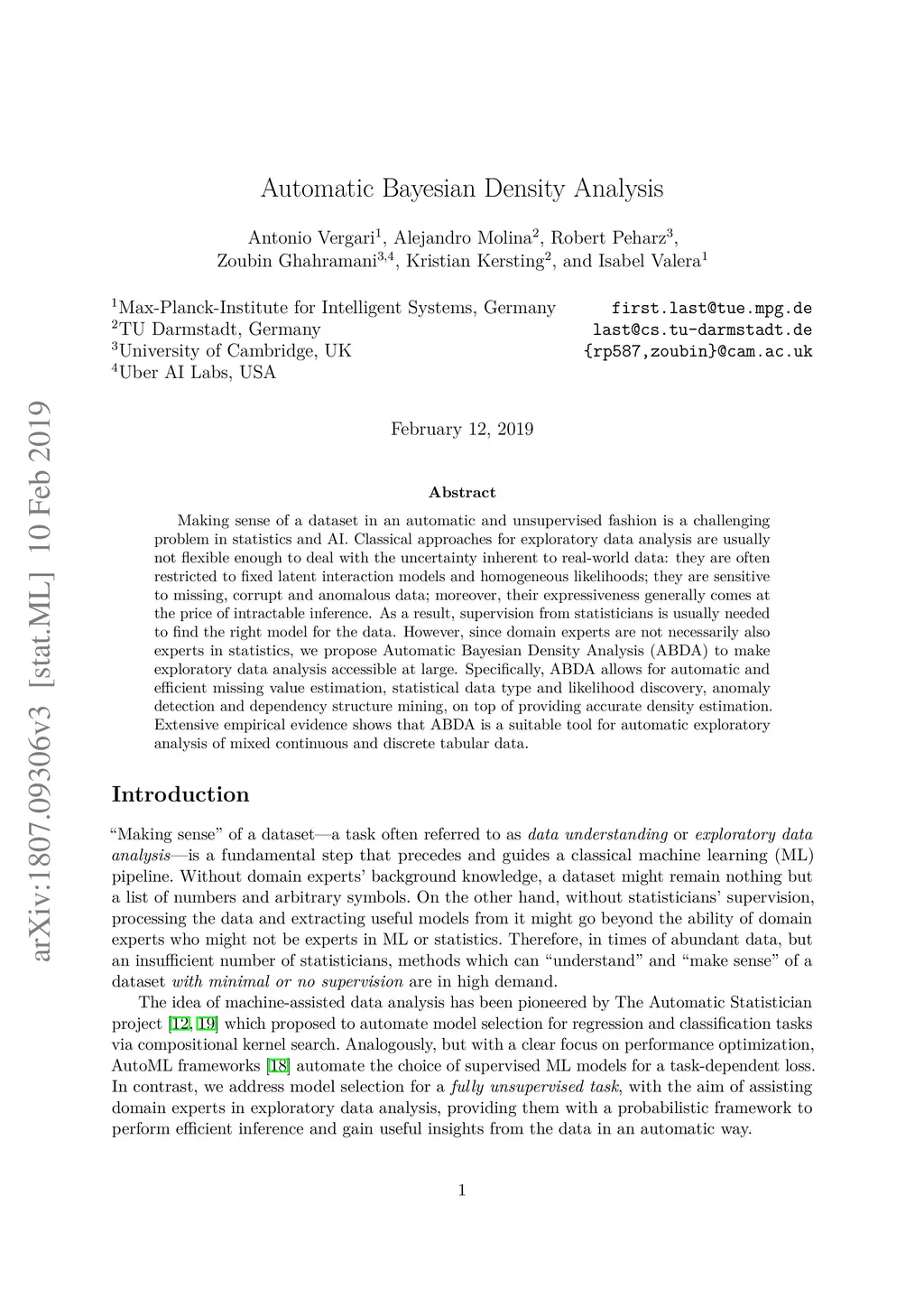 Making sense of a dataset in an automatic and unsupervised fashion is a challenging problem in statistics and AI. Classical approaches for {exploratory data analysis} are usually not flexible enough to deal with the uncertainty inherent to real-world data: they are often restricted to fixed latent interaction models and homogeneous likelihoods; they are sensitive to missing, corrupt and anomalous data; moreover, their expressiveness generally comes at the price of intractable inference. As a result, supervision from statisticians is usually needed to find the right model for the data. However, since domain experts are not necessarily also experts in statistics, we propose Automatic Bayesian Density Analysis (ABDA) to make exploratory data analysis accessible at large. Specifically, ABDA allows for automatic and efficient missing value estimation, statistical data type and likelihood discovery, anomaly detection and dependency structure mining, on top of providing accurate density estimation. Extensive empirical evidence shows that ABDA is a suitable tool for automatic exploratory analysis of mixed continuous and discrete tabular data.