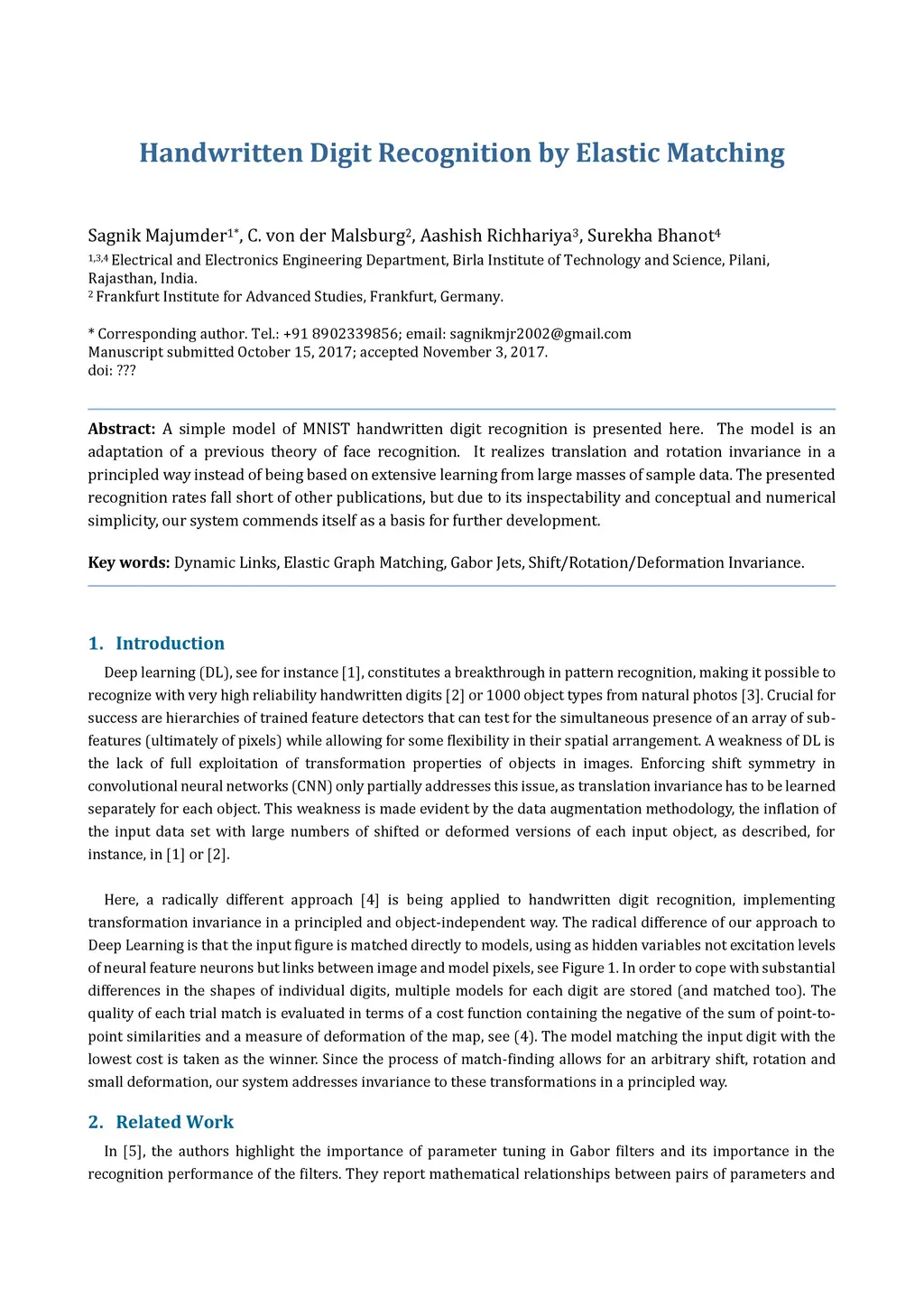 A simple model of MNIST handwritten digit recognition is presented here. The model is an adaptation of a previous theory of face recognition. It realizes translation and rotation invariance in a principled way instead of being based on extensive learning from large masses of sample data. The presented recognition rates fall short of other publications, but due to its inspectability and conceptual and numerical simplicity, our system commends itself as a basis for further development.