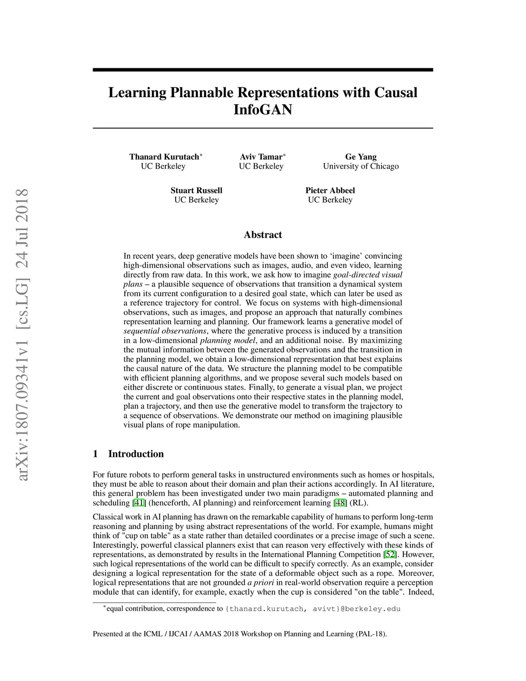In recent years, deep generative models have been shown to ímagine' convincing high-dimensional observations such as images, audio, and even video, learning directly from raw data. In this work, we ask how to imagine goal-directed visual plans -- a plausible sequence of observations that transition a dynamical system from its current configuration to a desired goal state, which can later be used as a reference trajectory for control. We focus on systems with high-dimensional observations, such as images, and propose an approach that naturally combines representation learning and planning. Our framework learns a generative model of sequential observations, where the generative process is induced by a transition in a low-dimensional planning model, and an additional noise. By maximizing the mutual information between the generated observations and the transition in the planning model, we obtain a low-dimensional representation that best explains the causal nature of the data. We structure the planning model to be compatible with efficient planning algorithms, and we propose several such models based on either discrete or continuous states. Finally, to generate a visual plan, we project the current and goal observations onto their respective states in the planning model, plan a trajectory, and then use the generative model to transform the trajectory to a sequence of observations. We demonstrate our method on imagining plausible visual plans of rope manipulation.