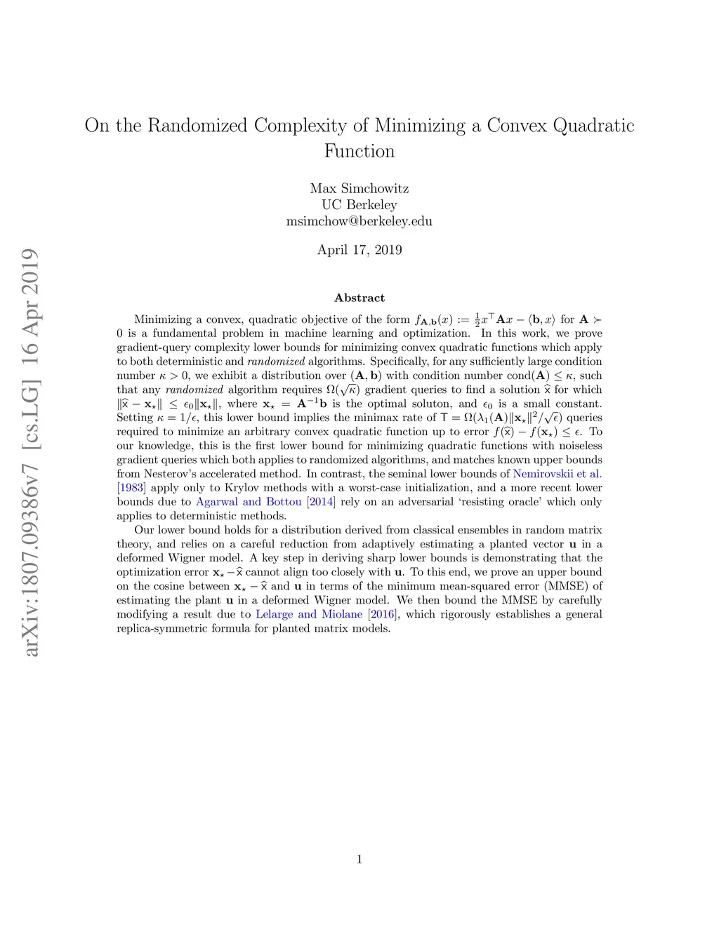 Minimizing a convex, quadratic objective of the form for $\mathbf{A} \succ 0 $ is a fundamental problem in machine learning and optimization. In this work, we prove gradient-query complexity lower bounds for minimizing convex quadratic functions which apply to both deterministic and \emph{randomized} algorithms. Specifically, for , we exhibit a distribution over with condition number , such that any \emph{randomized} algorithm requires gradient queries to find a solution for which , where is the optimal solution, and a small constant. Setting , this lower bound implies the minimax rate of queries required to minimize an arbitrary convex quadratic function up to error . Our lower bound holds for a distribution derived from classical ensembles in random matrix theory, and relies on a careful reduction from adaptively estimating a planted vector in a deformed Wigner model. A key step in deriving sharp lower bounds is demonstrating that the optimization error cannot align too closely with . To this end, we prove an upper bound on the cosine between and in terms of the MMSE of estimating the plant in a deformed Wigner model. We then bound the MMSE by carefully modifying a result due to Lelarge and Miolane 2016, which rigorously establishes a general replica-symmetric formula for planted matrix models.