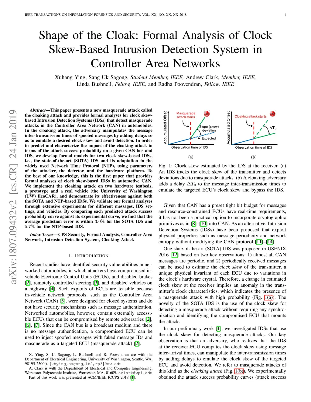 This paper presents a new masquerade attack called the cloaking attack and provides formal analyses for clock skew-based Intrusion Detection Systems (IDSs) that detect masquerade attacks in the Controller Area Network (CAN) in automobiles. In the cloaking attack, the adversary manipulates the message inter-transmission times of spoofed messages by adding delays so as to emulate a desired clock skew and avoid detection. In order to predict and characterize the impact of the cloaking attack in terms of the attack success probability on a given CAN bus and IDS, we develop formal models for two clock skew-based IDSs, i.e., the state-of-the-art (SOTA) IDS and its adaptation to the widely used Network Time Protocol (NTP), using parameters of the attacker, the detector, and the hardware platform. To the best of our knowledge, this is the first paper that provides formal analyses of clock skew-based IDSs in automotive CAN. We implement the cloaking attack on two hardware testbeds, a prototype and a real vehicle (the University of Washington (UW) EcoCAR), and demonstrate its effectiveness against both the SOTA and NTP-based IDSs. We validate our formal analyses through extensive experiments for different messages, IDS settings, and vehicles. By comparing each predicted attack success probability curve against its experimental curve, we find that the average prediction error is within 3.0% for the SOTA IDS and 5.7% for the NTP-based IDS.
