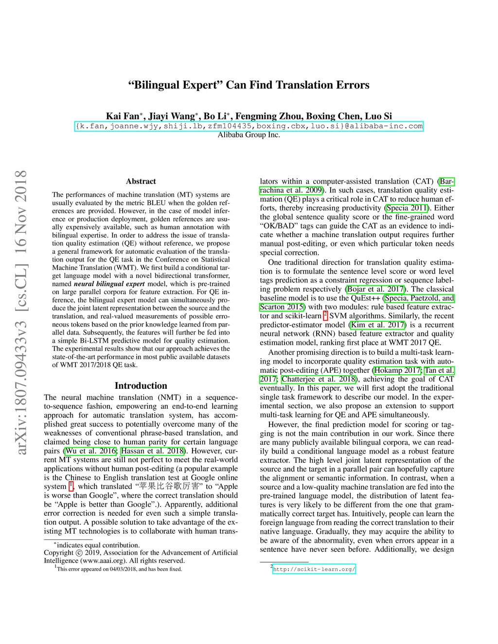 Recent advances in statistical machine translation via the adoption of neural sequence-to-sequence models empower the end-to-end system to achieve state-of-the-art in many WMT benchmarks. The performance of such machine translation (MT) system is usually evaluated by automatic metric BLEU when the golden references are provided for validation. However, for model inference or production deployment, the golden references are prohibitively available or require expensive human annotation with bilingual expertise. In order to address the issue of quality evaluation (QE) without reference, we propose a general framework for automatic evaluation of translation output for most WMT quality evaluation tasks. We first build a conditional target language model with a novel bidirectional transformer, named neural bilingual expert model, which is pre-trained on large parallel corpora for feature extraction. For QE inference, the bilingual expert model can simultaneously produce the joint latent representation between the source and the translation, and real-valued measurements of possible erroneous tokens based on the prior knowledge learned from parallel data. Subsequently, the features will further be fed into a simple Bi-LSTM predictive model for quality evaluation. The experimental results show that our approach achieves the state-of-the-art performance in the quality estimation track of WMT 2017/2018.
