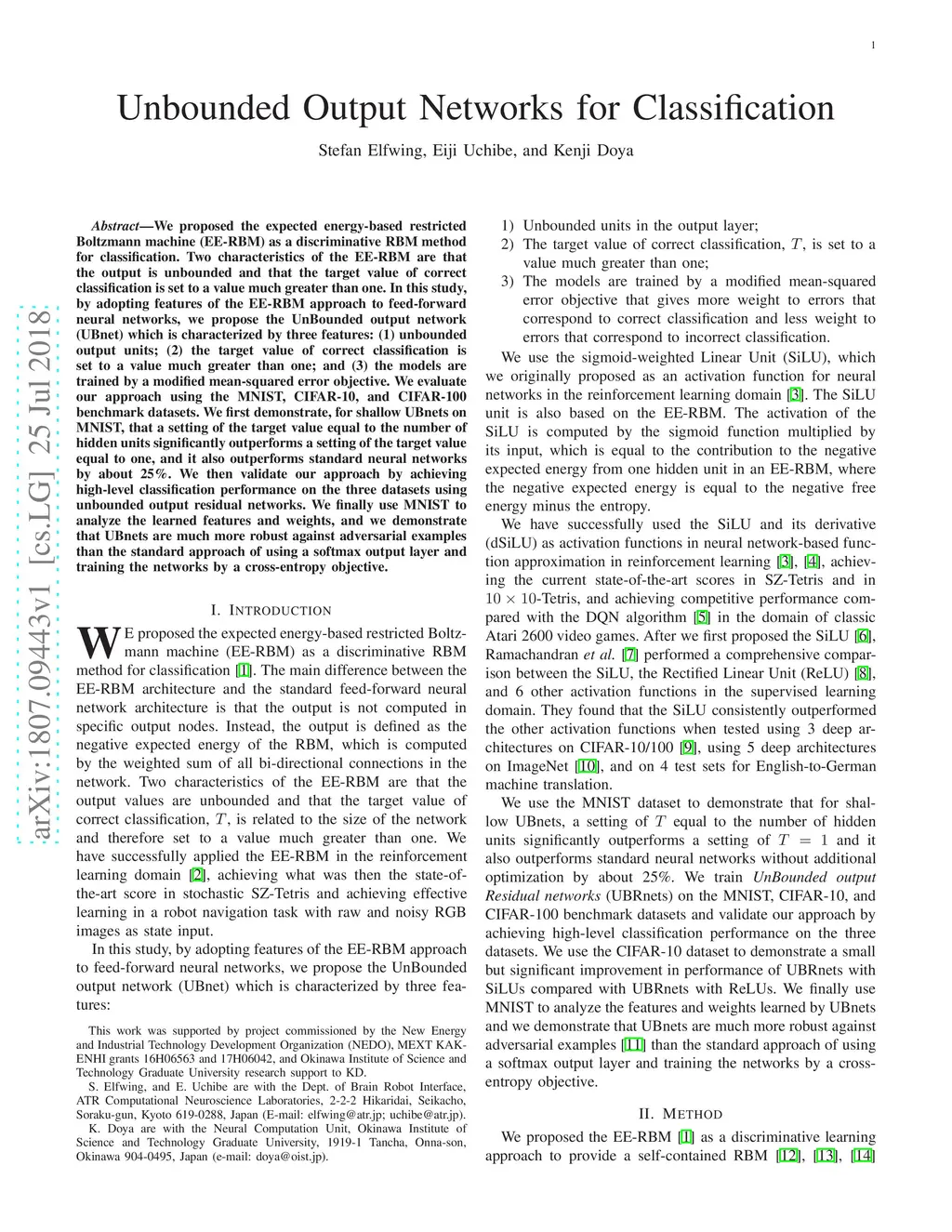 We proposed the expected energy-based restricted Boltzmann machine (EE-RBM) as a discriminative RBM method for classification. Two characteristics of the EE-RBM are that the output is unbounded and that the target value of correct classification is set to a value much greater than one. In this study, by adopting features of the EE-RBM approach to feed-forward neural networks, we propose the UnBounded output network (UBnet) which is characterized by three features: (1) unbounded output units; (2) the target value of correct classification is set to a value much greater than one; and (3) the models are trained by a modified mean-squared error objective. We evaluate our approach using the MNIST, CIFAR-10, and CIFAR-100 benchmark datasets. We first demonstrate, for shallow UBnets on MNIST, that a setting of the target value equal to the number of hidden units significantly outperforms a setting of the target value equal to one, and it also outperforms standard neural networks by about 25\%. We then validate our approach by achieving high-level classification performance on the three datasets using unbounded output residual networks. We finally use MNIST to analyze the learned features and weights, and we demonstrate that UBnets are much more robust against adversarial examples than the standard approach of using a softmax output layer and training the networks by a cross-entropy objective.
