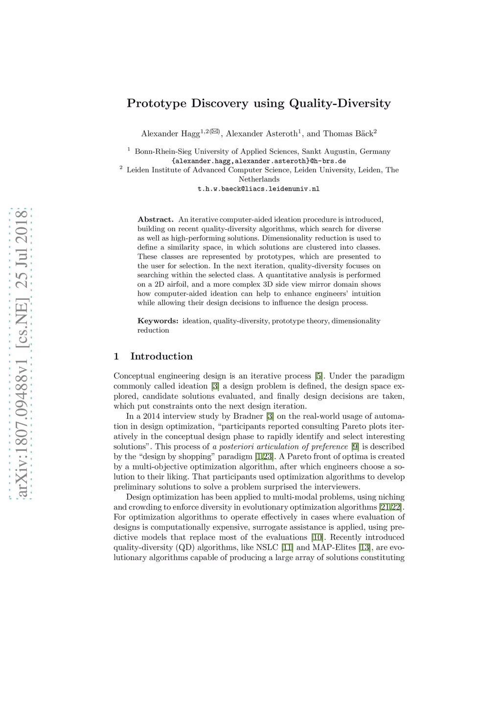 An iterative computer-aided ideation procedure is introduced, building on recent quality-diversity algorithms, which search for diverse as well as high-performing solutions. Dimensionality reduction is used to define a similarity space, in which solutions are clustered into classes. These classes are represented by prototypes, which are presented to the user for selection. In the next iteration, quality-diversity focuses on searching within the selected class. A quantitative analysis is performed on a 2D airfoil, and a more complex 3D side view mirror domain shows how computer-aided ideation can help to enhance engineers' intuition while allowing their design decisions to influence the design process.