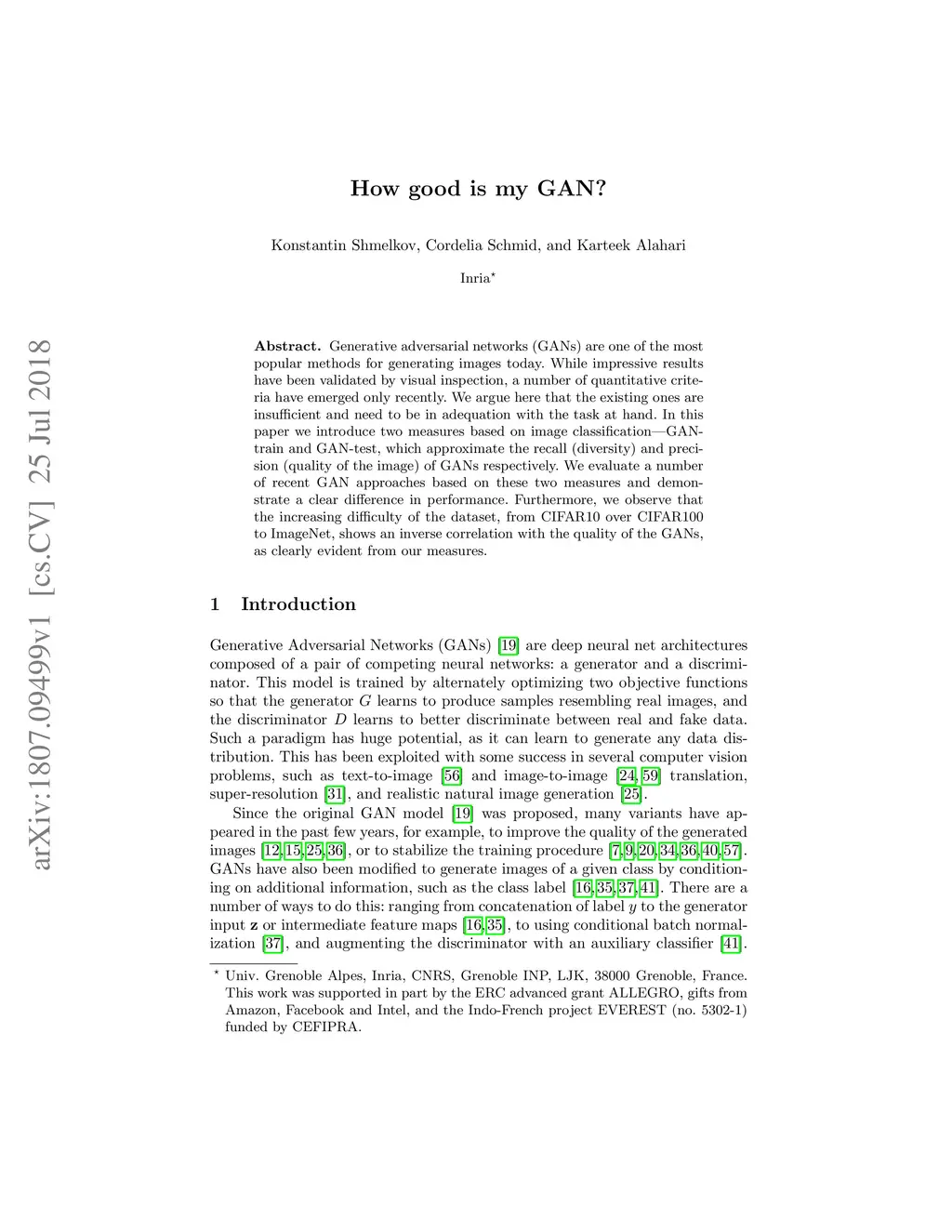 Generative adversarial networks (GANs) are one of the most popular methods for generating images today. While impressive results have been validated by visual inspection, a number of quantitative criteria have emerged only recently. We argue here that the existing ones are insufficient and need to be in adequation with the task at hand. In this paper we introduce two measures based on image classification---GAN-train and GAN-test, which approximate the recall (diversity) and precision (quality of the image) of GANs respectively. We evaluate a number of recent GAN approaches based on these two measures and demonstrate a clear difference in performance. Furthermore, we observe that the increasing difficulty of the dataset, from CIFAR10 over CIFAR100 to ImageNet, shows an inverse correlation with the quality of the GANs, as clearly evident from our measures.