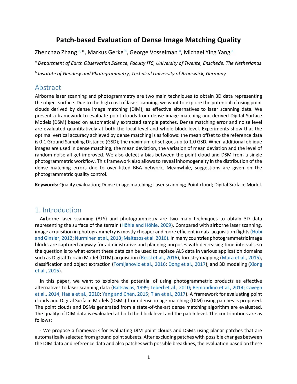 Airborne laser scanning and photogrammetry are two main techniques to obtain 3D data representing the object surface. Due to the high cost of laser scanning, we want to explore the potential of using point clouds derived by dense image matching (DIM), as effective alternatives to laser scanning data. We present a framework to evaluate point clouds from dense image matching and derived Digital Surface Models (DSM) based on automatically extracted sample patches. Dense matching error and noise level are evaluated quantitatively at both the local level and whole block level. Experiments show that the optimal vertical accuracy achieved by dense matching is as follows: the mean offset to the reference data is 0.1 Ground Sampling Distance (GSD); the maximum offset goes up to 1.0 GSD. When additional oblique images are used in dense matching, the mean deviation, the variation of mean deviation and the level of random noise all get improved. We also detect a bias between the point cloud and DSM from a single photogrammetric workflow. This framework also allows to reveal inhomogeneity in the distribution of the dense matching errors due to over-fitted BBA network. Meanwhile, suggestions are given on the photogrammetric quality control.