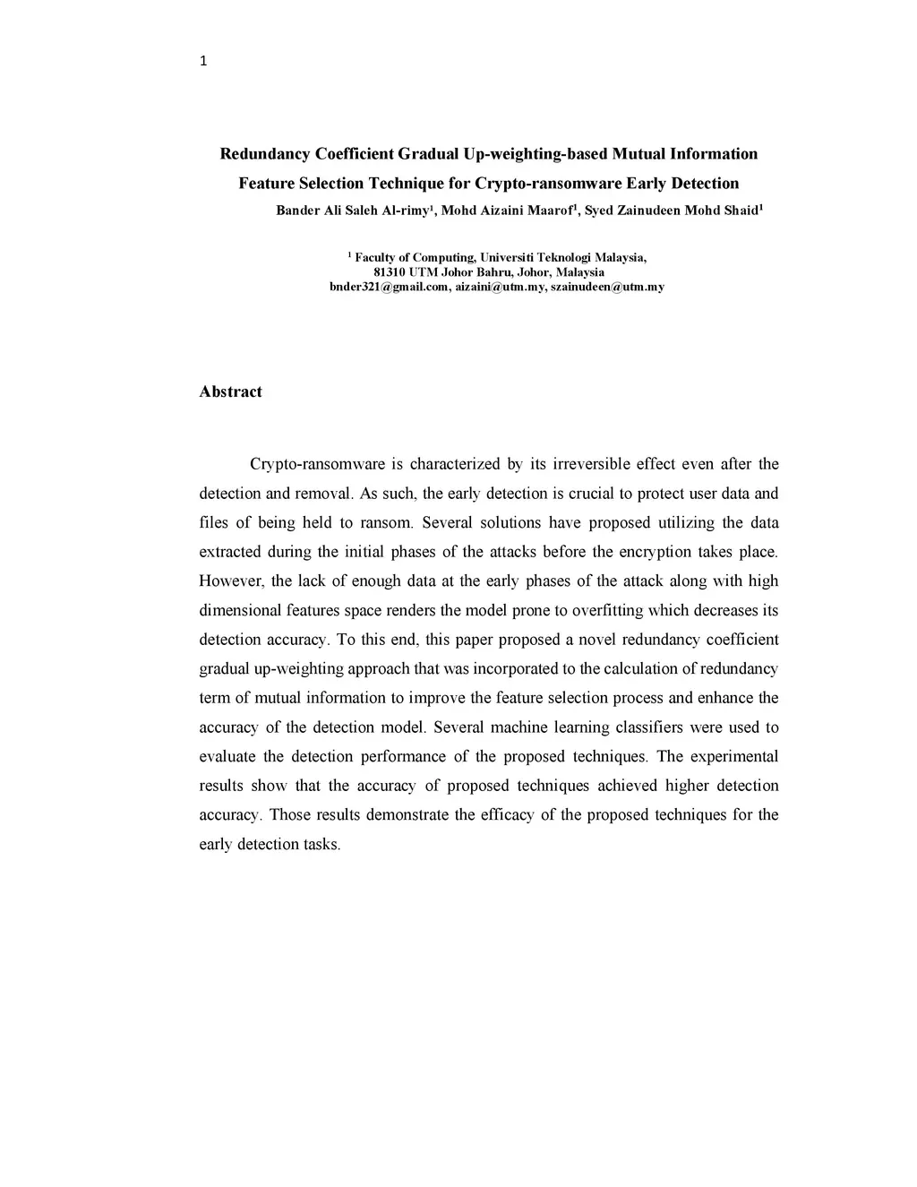 Crypto-ransomware is characterized by its irreversible effect even after the detection and removal. As such, the early detection is crucial to protect user data and files of being held to ransom. Several solutions have proposed utilizing the data extracted during the initial phases of the attacks before the encryption takes place. However, the lack of enough data at the early phases of the attack along with high dimensional features space renders the model prone to overfitting which decreases its detection accuracy. To this end, this paper proposed a novel redundancy coefficient gradual up-weighting approach that was incorporated to the calculation of redundancy term of mutual information to improve the feature selection process and enhance the accuracy of the detection model. Several machine learning classifiers were used to evaluate the detection performance of the proposed techniques. The experimental results show that the accuracy of proposed techniques achieved higher detection accuracy. Those results demonstrate the efficacy of the proposed techniques for the early detection tasks.