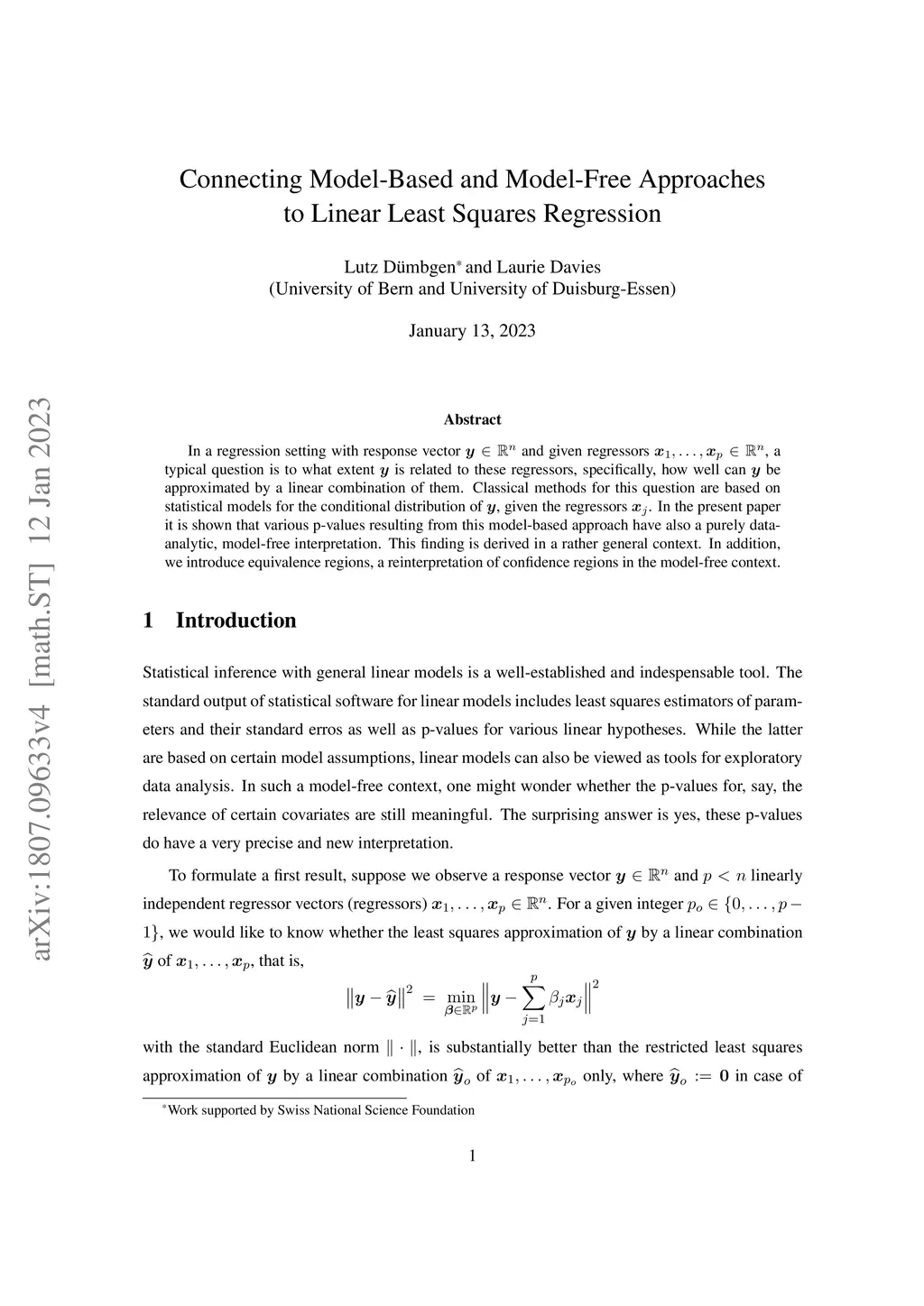 In a regression setting with response vector and given regressors , a typical question is to what extent is related to these regressors, specifically, how well can be approximated by a linear combination of them. Classical methods for this question are based on statistical models for the conditional distribution of , given the regressors . In the present paper it is shown that various p-values resulting from this model-based approach have also a purely data-analytic, model-free interpretation. This finding is derived in a rather general context. In addition, we introduce equivalence regions, a reinterpretation of confidence regions in the model-free context.