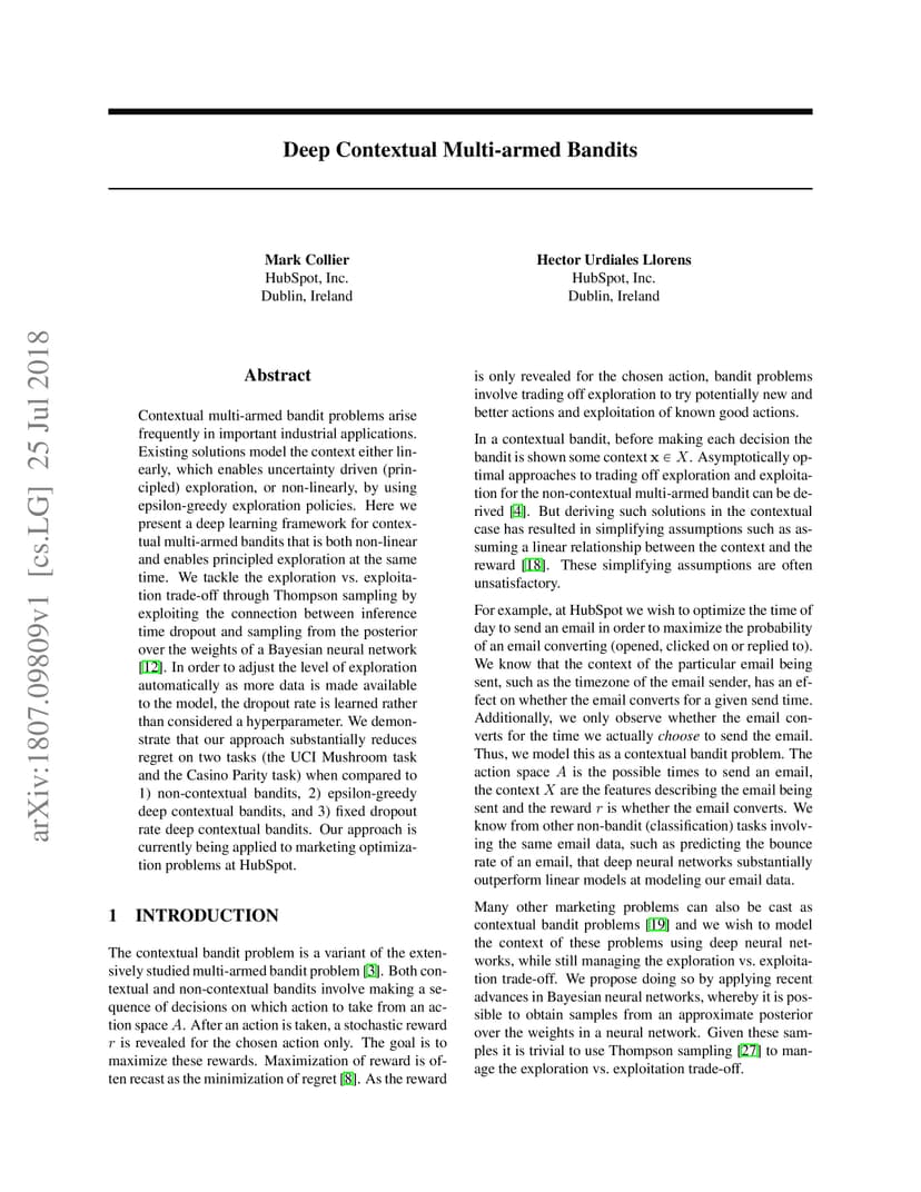Contextual multi-armed bandit problems arise frequently in important industrial applications. Existing solutions model the context either linearly, which enables uncertainty driven (principled) exploration, or non-linearly, by using epsilon-greedy exploration policies. Here we present a deep learning framework for contextual multi-armed bandits that is both non-linear and enables principled exploration at the same time. We tackle the exploration vs. exploitation trade-off through Thompson sampling by exploiting the connection between inference time dropout and sampling from the posterior over the weights of a Bayesian neural network. In order to adjust the level of exploration automatically as more data is made available to the model, the dropout rate is learned rather than considered a hyperparameter. We demonstrate that our approach substantially reduces regret on two tasks (the UCI Mushroom task and the Casino Parity task) when compared to 1) non-contextual bandits, 2) epsilon-greedy deep contextual bandits, and 3) fixed dropout rate deep contextual bandits. Our approach is currently being applied to marketing optimization problems at HubSpot.