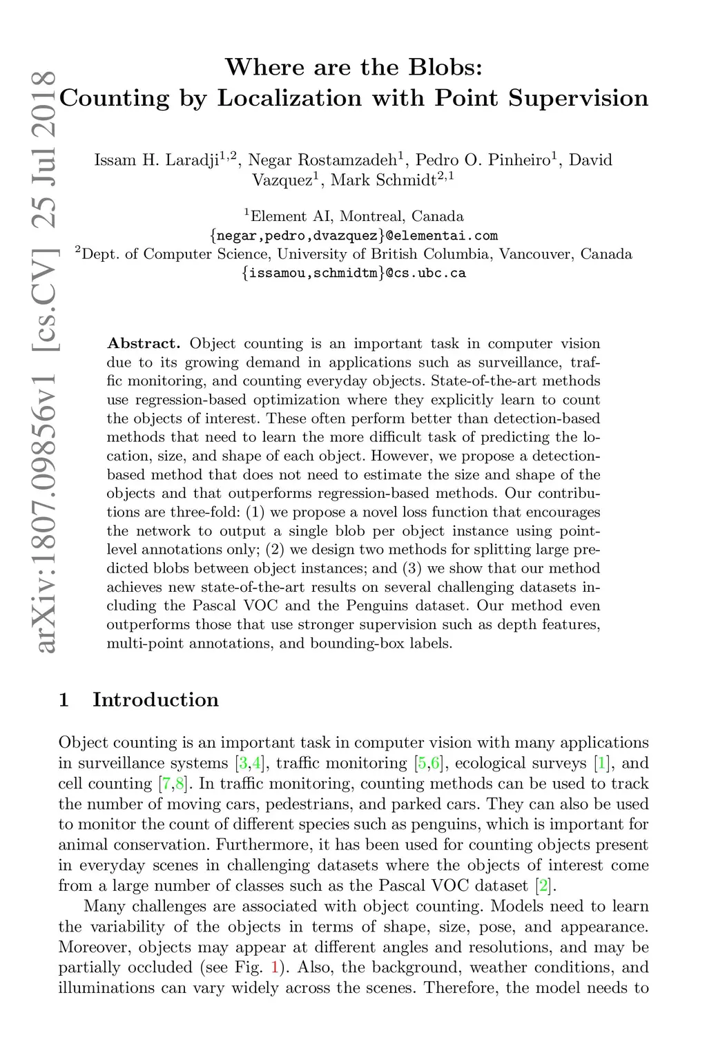 Object counting is an important task in computer vision due to its growing demand in applications such as surveillance, traffic monitoring, and counting everyday objects. State-of-the-art methods use regression-based optimization where they explicitly learn to count the objects of interest. These often perform better than detection-based methods that need to learn the more difficult task of predicting the location, size, and shape of each object. However, we propose a detection-based method that does not need to estimate the size and shape of the objects and that outperforms regression-based methods. Our contributions are three-fold: (1) we propose a novel loss function that encourages the network to output a single blob per object instance using point-level annotations only; (2) we design two methods for splitting large predicted blobs between object instances; and (3) we show that our method achieves new state-of-the-art results on several challenging datasets including the Pascal VOC and the Penguins dataset. Our method even outperforms those that use stronger supervision such as depth features, multi-point annotations, and bounding-box labels.