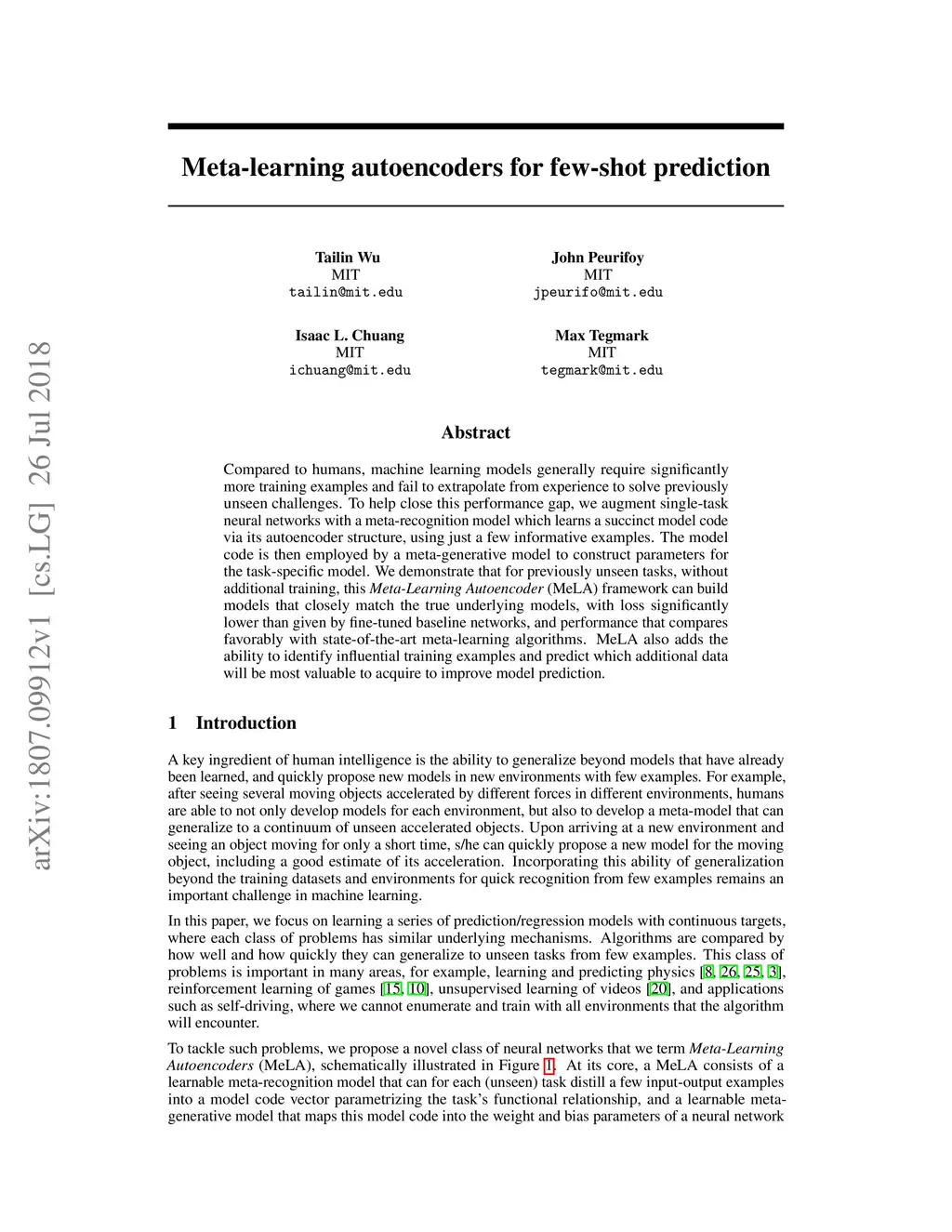 Compared to humans, machine learning models generally require significantly more training examples and fail to extrapolate from experience to solve previously unseen challenges. To help close this performance gap, we augment single-task neural networks with a meta-recognition model which learns a succinct model code via its autoencoder structure, using just a few informative examples. The model code is then employed by a meta-generative model to construct parameters for the task-specific model. We demonstrate that for previously unseen tasks, without additional training, this Meta-Learning Autoencoder (MeLA) framework can build models that closely match the true underlying models, with loss significantly lower than given by fine-tuned baseline networks, and performance that compares favorably with state-of-the-art meta-learning algorithms. MeLA also adds the ability to identify influential training examples and predict which additional data will be most valuable to acquire to improve model prediction.