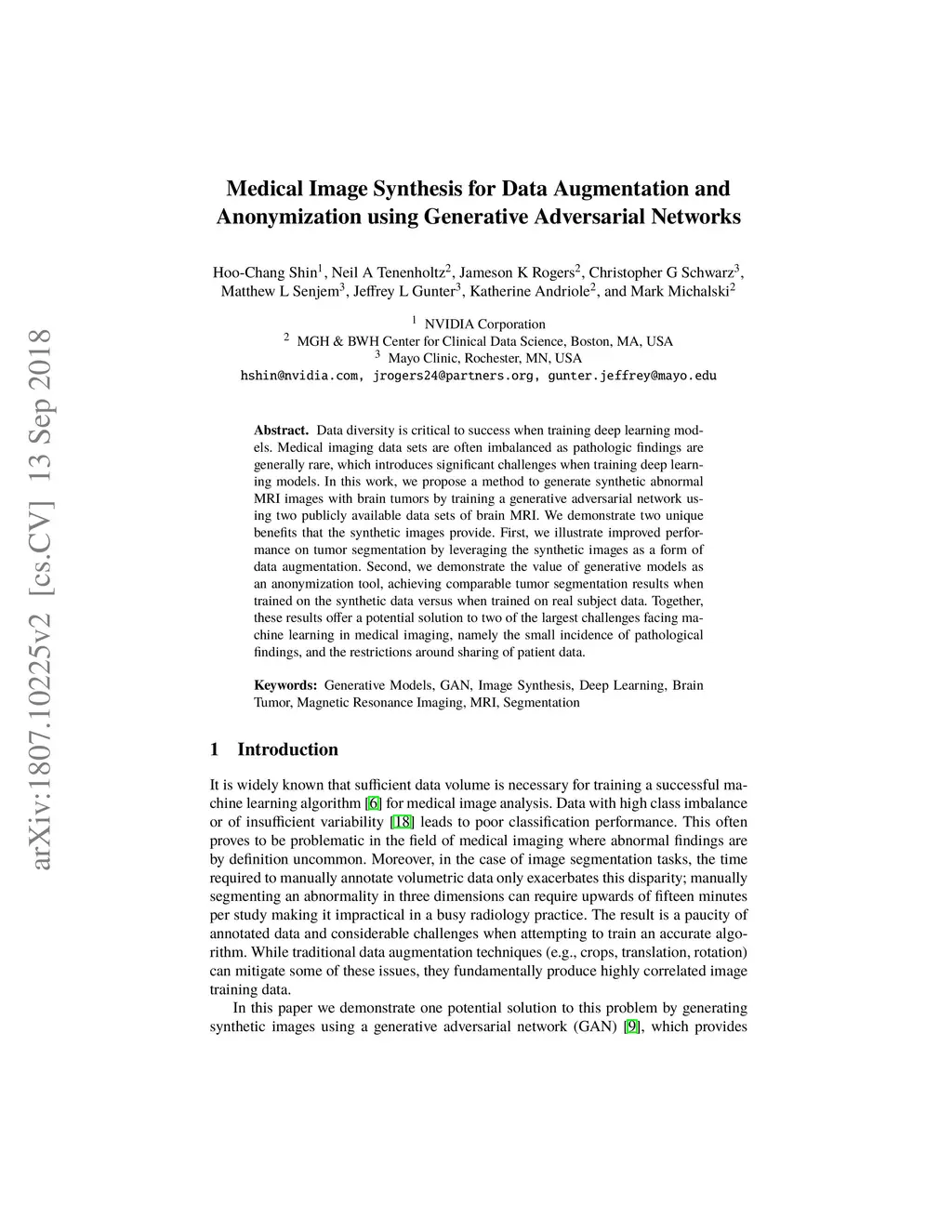 Data diversity is critical to success when training deep learning models. Medical imaging data sets are often imbalanced as pathologic findings are generally rare, which introduces significant challenges when training deep learning models. In this work, we propose a method to generate synthetic abnormal MRI images with brain tumors by training a generative adversarial network using two publicly available data sets of brain MRI. We demonstrate two unique benefits that the synthetic images provide. First, we illustrate improved performance on tumor segmentation by leveraging the synthetic images as a form of data augmentation. Second, we demonstrate the value of generative models as an anonymization tool, achieving comparable tumor segmentation results when trained on the synthetic data versus when trained on real subject data. Together, these results offer a potential solution to two of the largest challenges facing machine learning in medical imaging, namely the small incidence of pathological findings, and the restrictions around sharing of patient data.
