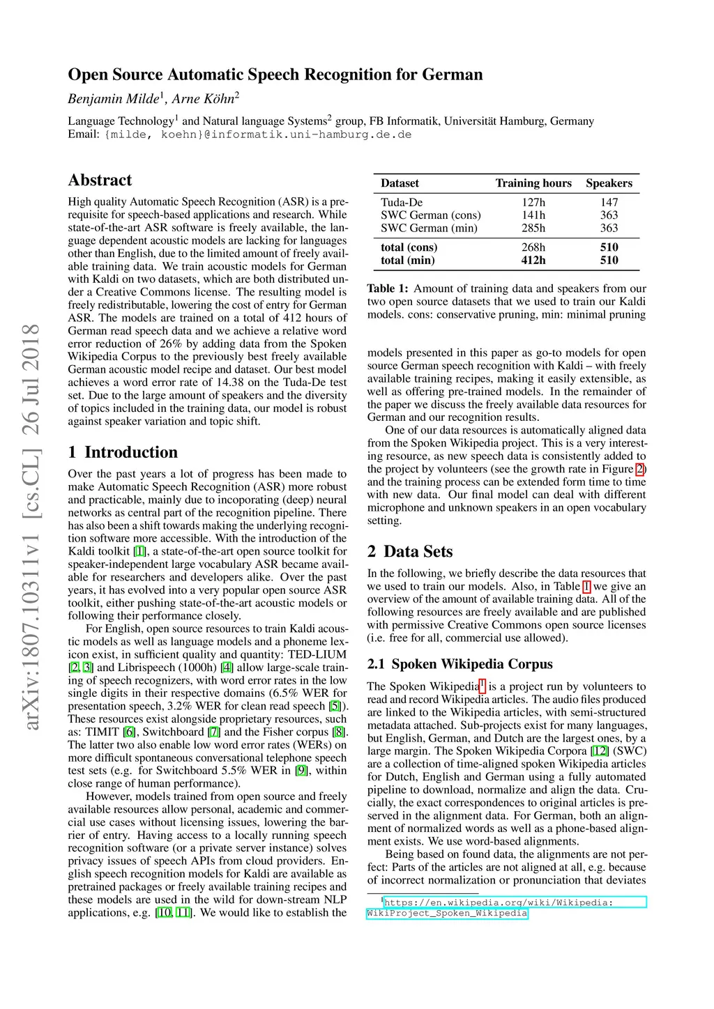High quality Automatic Speech Recognition (ASR) is a prerequisite for speech-based applications and research. While state-of-the-art ASR software is freely available, the language dependent acoustic models are lacking for languages other than English, due to the limited amount of freely available training data. We train acoustic models for German with Kaldi on two datasets, which are both distributed under a Creative Commons license. The resulting model is freely redistributable, lowering the cost of entry for German ASR. The models are trained on a total of 412 hours of German read speech data and we achieve a relative word error reduction of 26% by adding data from the Spoken Wikipedia Corpus to the previously best freely available German acoustic model recipe and dataset. Our best model achieves a word error rate of 14.38 on the Tuda-De test set. Due to the large amount of speakers and the diversity of topics included in the training data, our model is robust against speaker variation and topic shift.