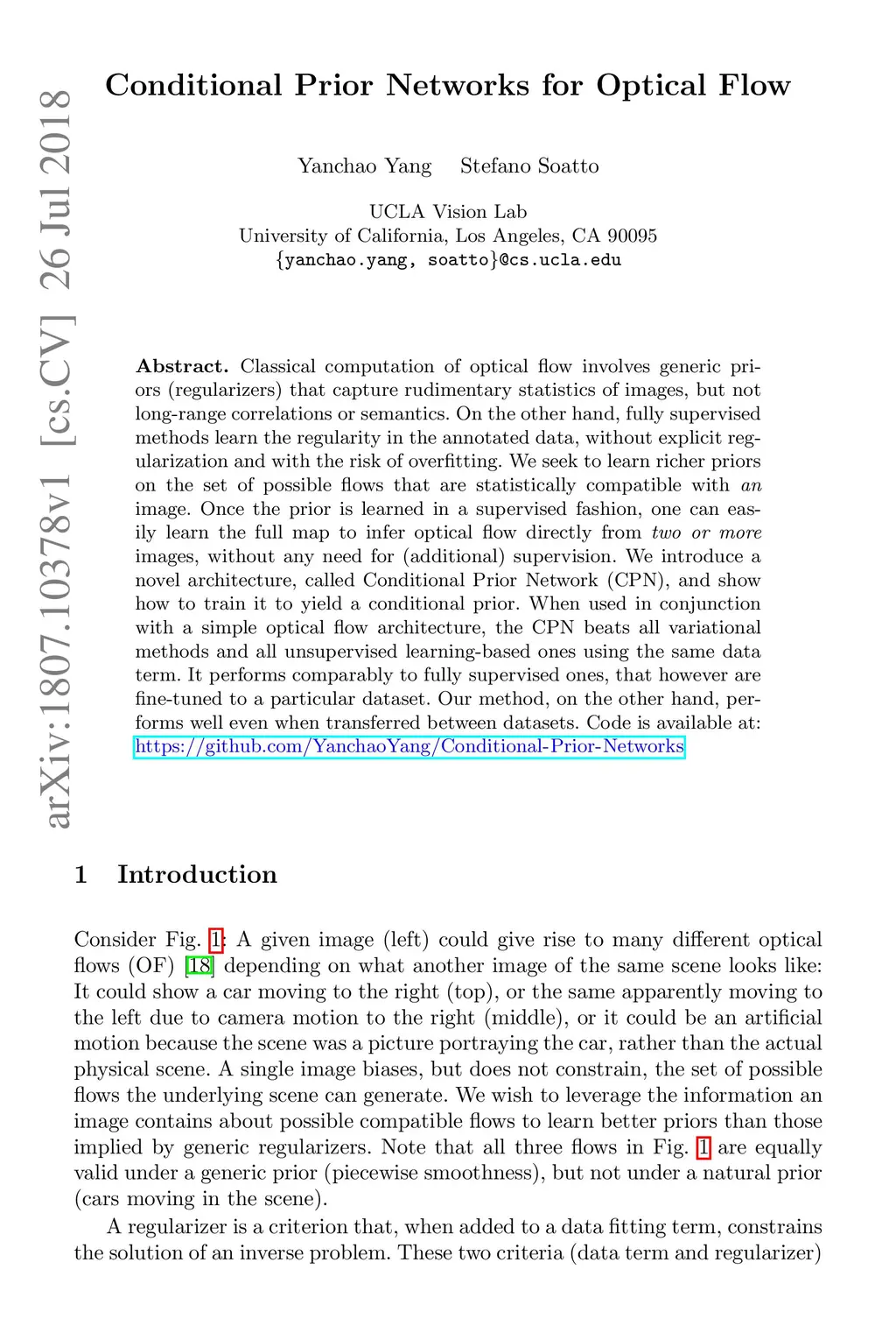 Classical computation of optical flow involves generic priors (regularizers) that capture rudimentary statistics of images, but not long-range correlations or semantics. On the other hand, fully supervised methods learn the regularity in the annotated data, without explicit regularization and with the risk of overfitting. We seek to learn richer priors on the set of possible flows that are statistically compatible with an image. Once the prior is learned in a supervised fashion, one can easily learn the full map to infer optical flow directly from two or more images, without any need for (additional) supervision. We introduce a novel architecture, called Conditional Prior Network (CPN), and show how to train it to yield a conditional prior. When used in conjunction with a simple optical flow architecture, the CPN beats all variational methods and all unsupervised learning-based ones using the same data term. It performs comparably to fully supervised ones, that however are fine-tuned to a particular dataset. Our method, on the other hand, performs well even when transferred between datasets.