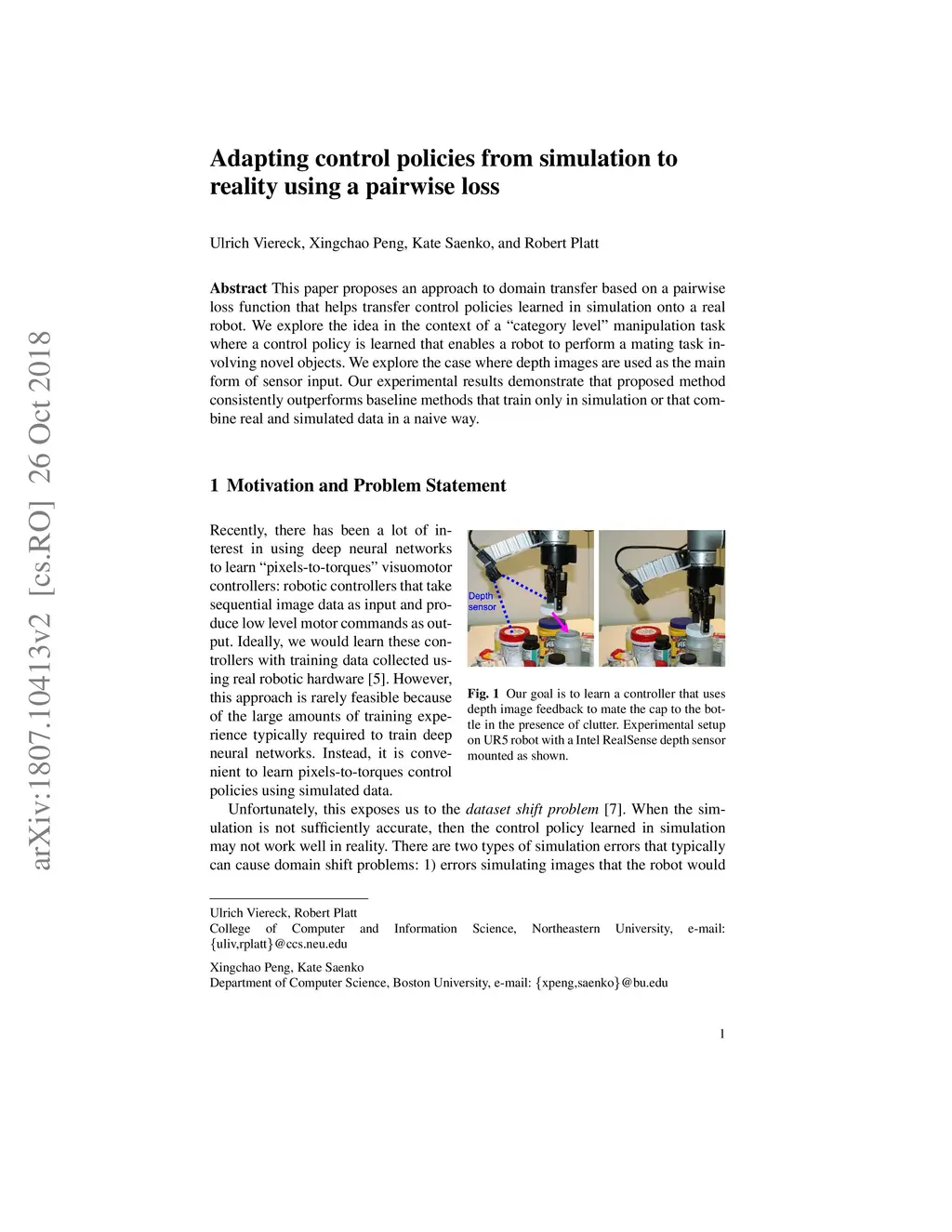 This paper proposes an approach to domain transfer based on a pairwise loss function that helps transfer control policies learned in simulation onto a real robot. We explore the idea in the context of a 'category level' manipulation task where a control policy is learned that enables a robot to perform a mating task involving novel objects. We explore the case where depth images are used as the main form of sensor input. Our experimental results demonstrate that proposed method consistently outperforms baseline methods that train only in simulation or that combine real and simulated data in a naive way.