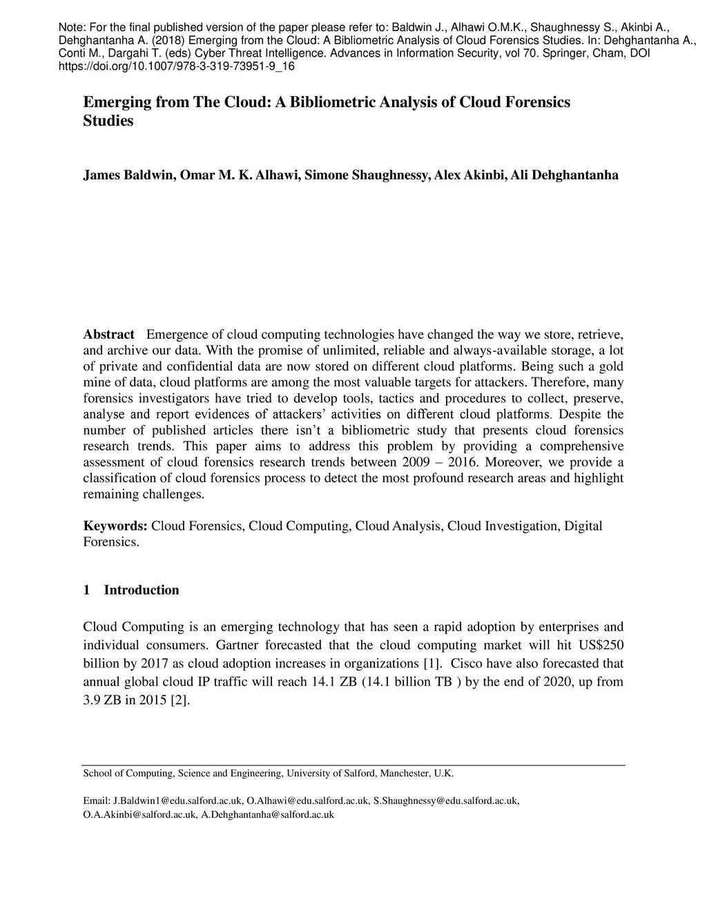 Emerging from The Cloud: A Bibliometric Analysis of Cloud Forensics
