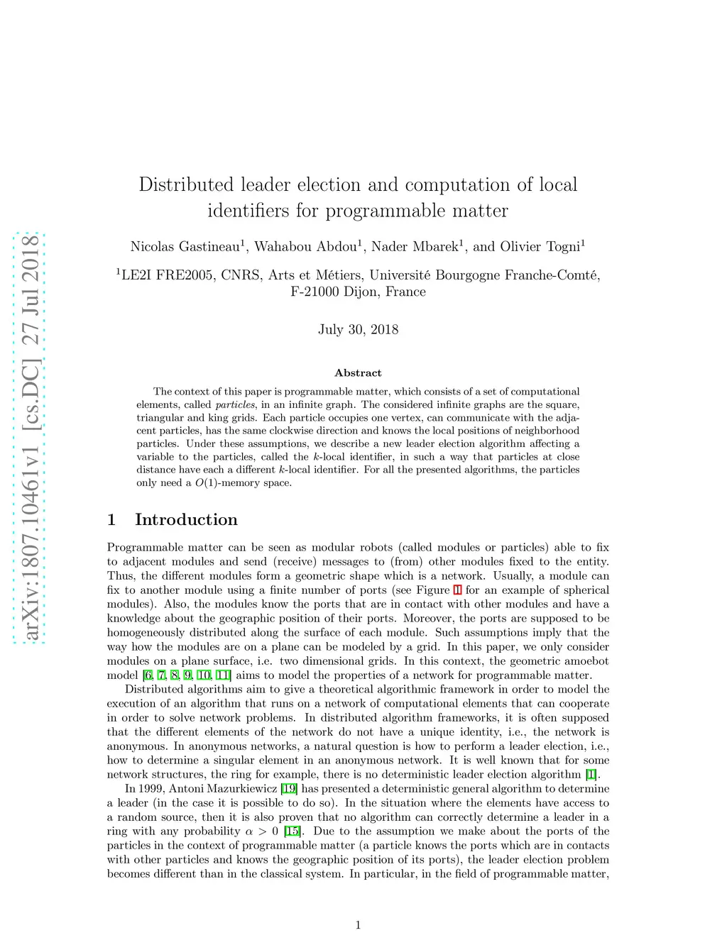 The context of this paper is programmable matter, which consists of a set of computational elements, called particles, in an infinite graph. The considered infinite graphs are the square, triangular and king grids. Each particle occupies one vertex, can communicate with the adjacent particles, has the same clockwise direction and knows the local positions of neighborhood particles. Under these assumptions, we describe a new leader election algorithm affecting a variable to the particles, called the k-local identifier, in such a way that particles at close distance have each a different k-local identifier. For all the presented algorithms, the particles only need a O(1)-memory space.