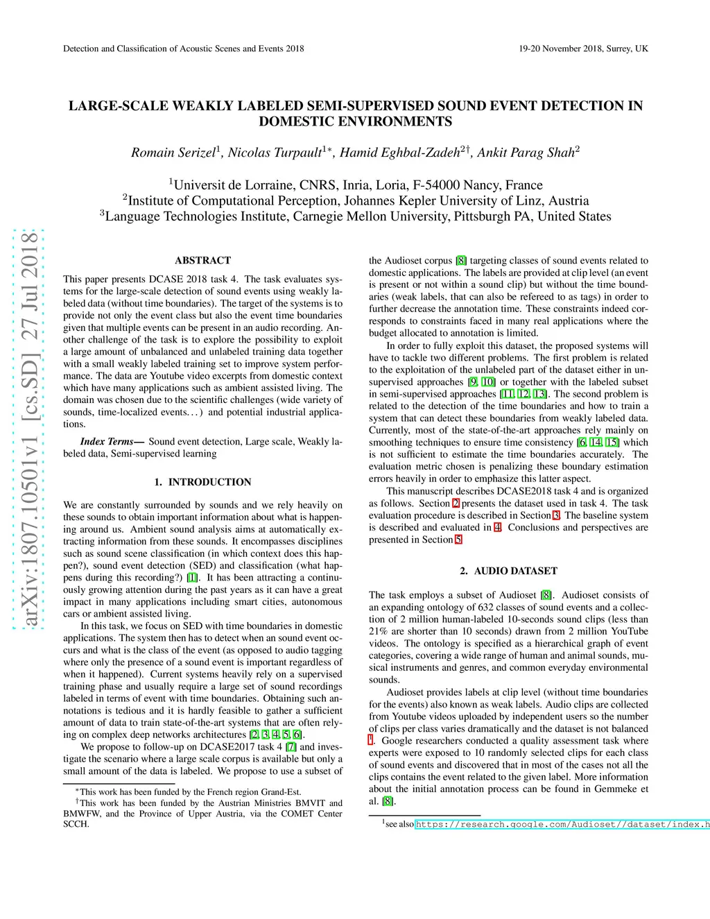 This paper presents DCASE 2018 task 4. The task evaluates systems for the large-scale detection of sound events using weakly labeled data (without time boundaries). The target of the systems is to provide not only the event class but also the event time boundaries given that multiple events can be present in an audio recording. Another challenge of the task is to explore the possibility to exploit a large amount of unbalanced and unlabeled training data together with a small weakly labeled training set to improve system performance. The data are Youtube video excerpts from domestic context which have many applications such as ambient assisted living. The domain was chosen due to the scientific challenges (wide variety of sounds, time-localized events.. .) and potential industrial applications .