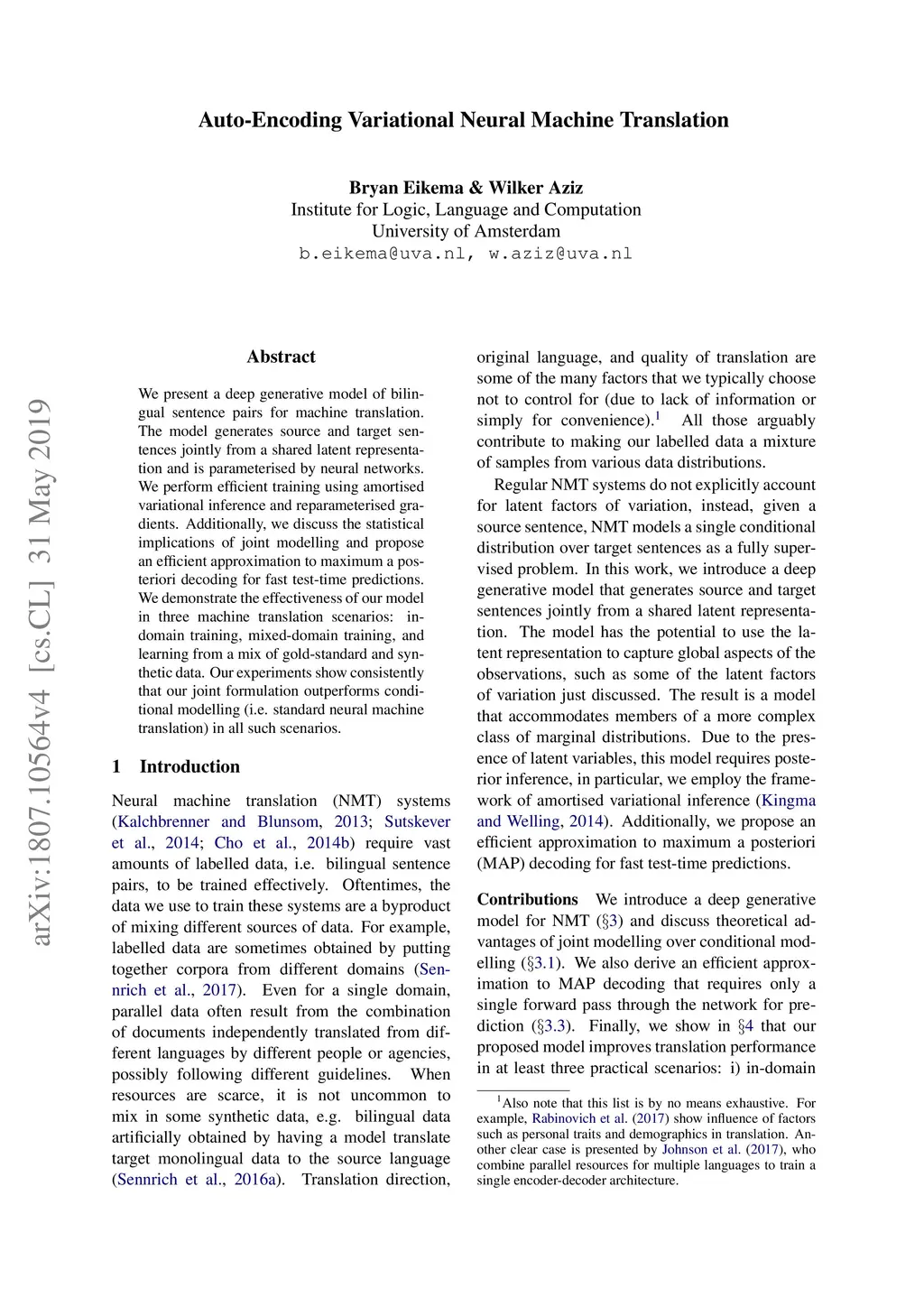 We present a deep generative model of bilingual sentence pairs for machine translation. The model generates source and target sentences jointly from a shared latent representation and is parameterised by neural networks. We perform efficient training using amortised variational inference and reparameterised gradients. Additionally, we discuss the statistical implications of joint modelling and propose an efficient approximation to maximum a posteriori decoding for fast test-time predictions. We demonstrate the effectiveness of our model in three machine translation scenarios: in-domain training, mixed-domain training, and learning from a mix of gold-standard and synthetic data. Our experiments show consistently that our joint formulation outperforms conditional modelling (i.e. standard neural machine translation) in all such scenarios.