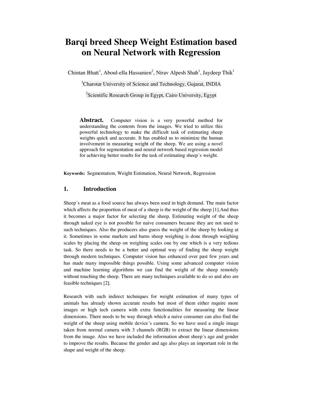 Computer vision is a very powerful method for understanding the contents from the images. We tried to utilize this powerful technology to make the difficult task of estimating sheep weights quick and accurate. It has enabled us to minimize the human involvement in measuring weight of the sheep. We are using a novel approach for segmentation and neural network based regression model for achieving better results for the task of estimating sheep weight.