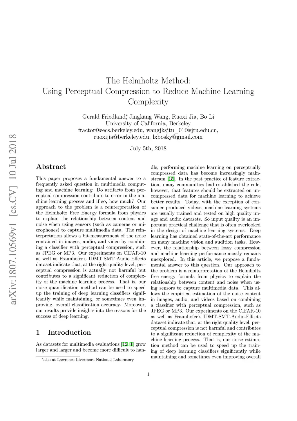 This paper proposes a fundamental answer to a frequently asked question in multimedia computing and machine learning: Do artifacts from perceptual compression contribute to error in the machine learning process and if so, how much? Our approach to the problem is a reinterpretation of the Helmholtz Free Energy formula from physics to explain the relationship between content and noise when using sensors (such as cameras or microphones) to capture multimedia data. The reinterpretation allows a bit-measurement of the noise contained in images, audio, and video by combining a classifier with perceptual compression, such as JPEG or MP3. Our experiments on CIFAR-10 as well as Fraunhofer's IDMT-SMT-Audio-Effects dataset indicate that, at the right quality level, perceptual compression is actually not harmful but contributes to a significant reduction of complexity of the machine learning process. That is, our noise quantification method can be used to speed up the training of deep learning classifiers significantly while maintaining, or sometimes even improving, overall classification accuracy. Moreover, our results provide insights into the reasons for the success of deep learning.
