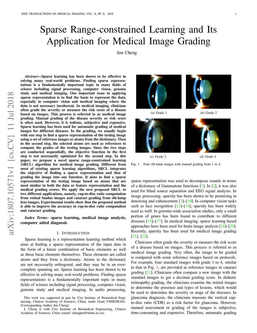 Sparse learning has been shown to be effective in solving many real-world problems. Finding sparse representations is a fundamentally important topic in many fields of science including signal processing, computer vision, genome study and medical imaging. One important issue in applying sparse representation is to find the basis to represent the data,especially in computer vision and medical imaging where the data is not necessary incoherent. In medical imaging, clinicians often grade the severity or measure the risk score of a disease based on images. This process is referred to as medical image grading. Manual grading of the disease severity or risk score is often used. However, it is tedious, subjective and expensive. Sparse learning has been used for automatic grading of medical images for different diseases. In the grading, we usually begin with one step to find a sparse representation of the testing image using a set of reference images or atoms from the dictionary. Then in the second step, the selected atoms are used as references to compute the grades of the testing images. Since the two steps are conducted sequentially, the objective function in the first step is not necessarily optimized for the second step. In this paper, we propose a novel sparse range-constrained learning(SRCL)algorithm for medical image grading.Different from most of existing sparse learning algorithms, SRCL integrates the objective of finding a sparse representation and that of grading the image into one function. It aims to find a sparse representation of the testing image based on atoms that are most similar in both the data or feature representation and the medical grading scores. We apply the new proposed SRCL to CDR computation and cataract grading. Experimental results show that the proposed method is able to improve the accuracy in cup-to-disc ratio computation and cataract grading.