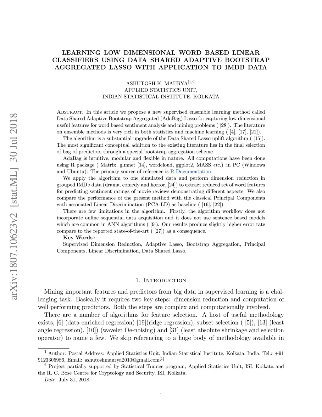 In this article we propose a new supervised ensemble learning method called Data Shared Adaptive Bootstrap Aggregated (AdaBag) Lasso for capturing low dimensional useful features for word based sentiment analysis and mining problems. The literature on ensemble methods is very rich in both statistics and machine learning. The algorithm is a substantial upgrade of the Data Shared Lasso uplift algorithm. The most significant conceptual addition to the existing literature lies in the final selection of bag of predictors through a special bootstrap aggregation scheme. We apply the algorithm to one simulated data and perform dimension reduction in grouped IMDb data (drama, comedy and horror) to extract reduced set of word features for predicting sentiment ratings of movie reviews demonstrating different aspects. We also compare the performance of the present method with the classical Principal Components with associated Linear Discrimination (PCA-LD) as baseline. There are few limitations in the algorithm. Firstly, the algorithm workflow does not incorporate online sequential data acquisition and it does not use sentence based models which are common in ANN algorithms . Our results produce slightly higher error rate compare to the reported state-of-the-art as a consequence.