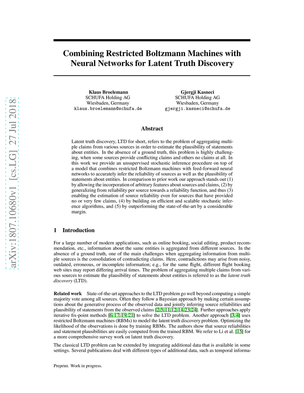 Latent truth discovery, LTD for short, refers to the problem of aggregating ltiple claims from various sources in order to estimate the plausibility of atements about entities. In the absence of a ground truth, this problem is highly challenging, when some sources provide conflicting claims and others no claims at all. In this work we provide an unsupervised stochastic inference procedure on top of a model that combines restricted Boltzmann machines with feed-forward neural networks to accurately infer the reliability of sources as well as the plausibility of statements about entities. In comparison to prior work our approach stands out (1) by allowing the incorporation of arbitrary features about sources and claims, (2) by generalizing from reliability per source towards a reliability function, and thus (3) enabling the estimation of source reliability even for sources that have provided no or very few claims, (4) by building on efficient and scalable stochastic inference algorithms, and (5) by outperforming the state-of-the-art by a considerable margin.