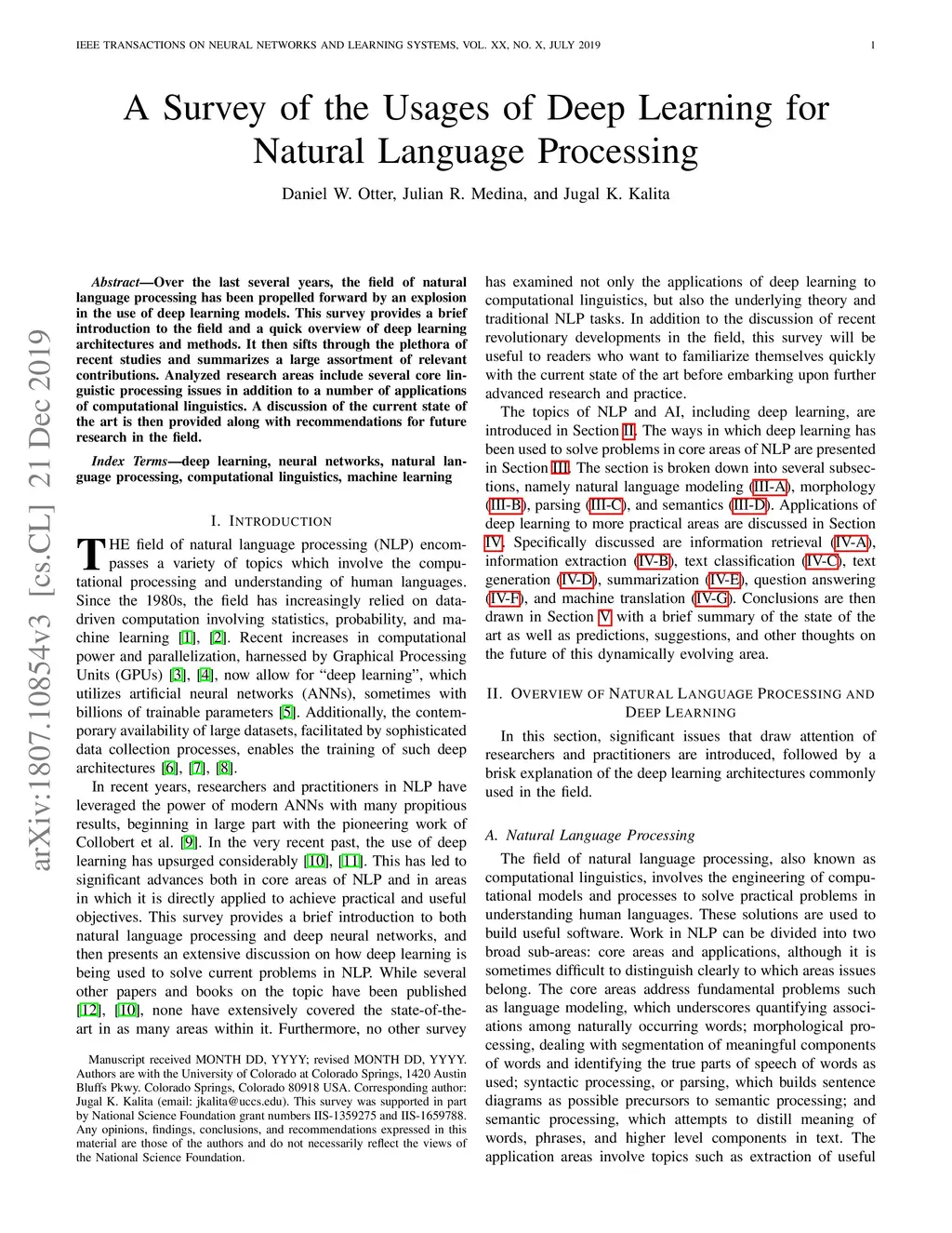 Over the last several years, the field of natural language processing has been propelled forward by an explosion in the use of deep learning models. This survey provides a brief introduction to the field and a quick overview of deep learning architectures and methods. It then sifts through the plethora of recent studies and summarizes a large assortment of relevant contributions. Analyzed research areas include several core linguistic processing issues in addition to a number of applications of computational linguistics. A discussion of the current state of the art is then provided along with recommendations for future research in the field.