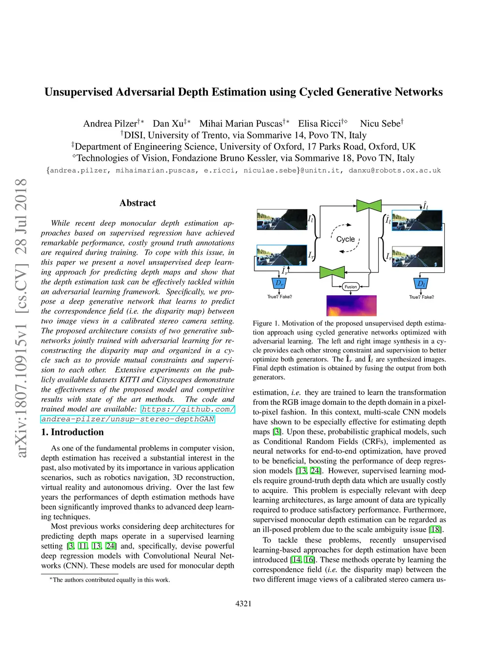 Unsupervised Adversarial Depth Estimation using Cycled Generative