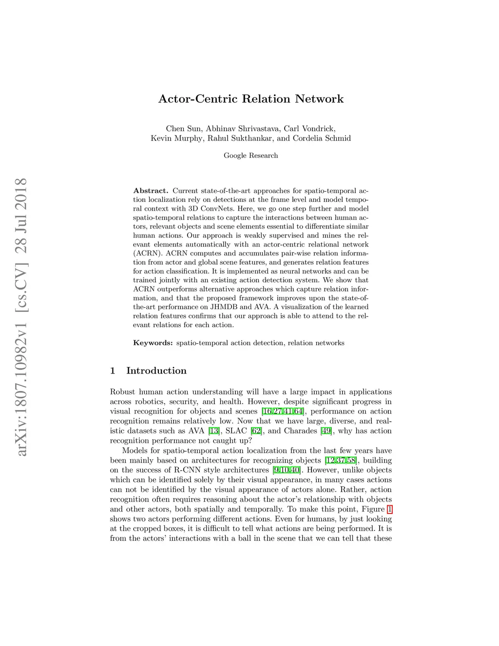 Current state-of-the-art approaches for spatio-temporal action localization rely on detections at the frame level and model temporal context with 3D ConvNets. Here, we go one step further and model spatio-temporal relations to capture the interactions between human actors, relevant objects and scene elements essential to differentiate similar human actions. Our approach is weakly supervised and mines the relevant elements automatically with an actor-centric relational network (ACRN). ACRN computes and accumulates pair-wise relation information from actor and global scene features, and generates relation features for action classification. It is implemented as neural networks and can be trained jointly with an existing action detection system. We show that ACRN outperforms alternative approaches which capture relation information, and that the proposed framework improves upon the state-of-the-art performance on JHMDB and AVA. A visualization of the learned relation features confirms that our approach is able to attend to the relevant relations for each action.