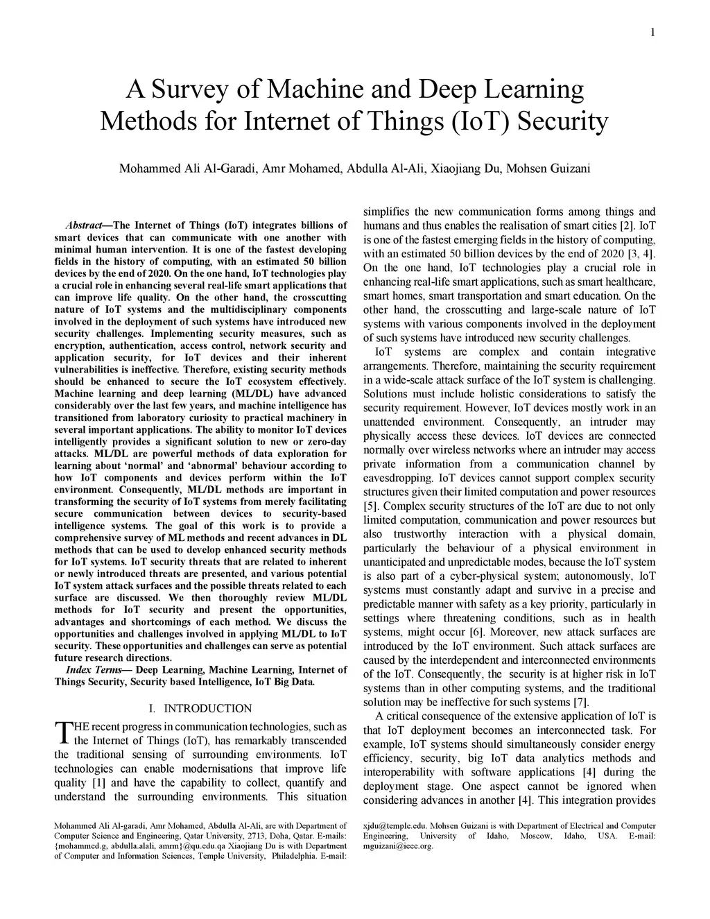 The Internet of Things (IoT) integrates billions of smart devices that can communicate with one another with minimal human intervention. It is one of the fastest developing fields in the history of computing, with an estimated 50 billion devices by the end of 2020. On the one hand, IoT play a crucial role in enhancing several real-life smart applications that can improve life quality. On the other hand, the crosscutting nature of IoT systems and the multidisciplinary components involved in the deployment of such systems introduced new security challenges. Implementing security measures, such as encryption, authentication, access control, network security and application security, for IoT devices and their inherent vulnerabilities is ineffective. Therefore, existing security methods should be enhanced to secure the IoT system effectively. Machine learning and deep learning (ML/DL) have advanced considerably over the last few years, and machine intelligence has transitioned from laboratory curiosity to practical machinery in several important applications. Consequently, ML/DL methods are important in transforming the security of IoT systems from merely facilitating secure communication between devices to security-based intelligence systems. The goal of this work is to provide a comprehensive survey of ML /DL methods that can be used to develop enhanced security methods for IoT systems. IoT security threats that are related to inherent or newly introduced threats are presented, and various potential IoT system attack surfaces and the possible threats related to each surface are discussed. We then thoroughly review ML/DL methods for IoT security and present the opportunities, advantages and shortcomings of each method. We discuss the opportunities and challenges involved in applying ML/DL to IoT security. These opportunities and challenges can serve as potential future research directions.
