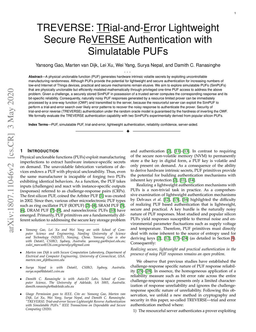 A physical unclonable function (PUF) generates hardware intrinsic volatile secrets by exploiting uncontrollable manufacturing randomness. Although PUFs provide the potential for lightweight and secure authentication for increasing numbers of low-end Internet of Things devices, practical and secure mechanisms remain elusive. Our work aims to explore simulatable PUFs (SimPUFs) that are physically unclonable but efficiently modeled mathematically through privileged one-time PUF access to address the problem of authentication for resource limited devices. Given a challenge, a securely stored SimPUF in possession of a trusted server computes the corresponding response and its bit-specific reliability. Consequently, naturally noisy PUF responses generated by a resource limited prover can be immediately processed by a one-way function (OWF) and transmitted to a server, because the resourceful server can exploit the SimPUF to perform a trial-and-error search over likely error patterns to recover the noisy response to authenticate the prover. Security of trial-and-error reverse (TREVERSE) authentication under the random oracle model is guaranteed by the hardness of inverting the OWF. We formally evaluate the authentication capability of TREVERSE authentication with two SimPUFs experimentally derived from popular silicon PUFs. Extensive evaluations demonstrate that our novel authentication mechanism can replace classical entity/client authentication without reliance on digitally stored non-volatile keys.