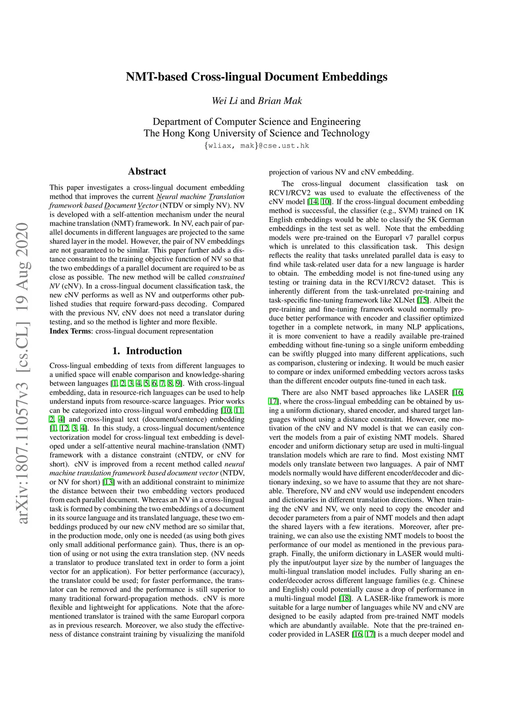 This paper investigates a cross-lingual document embedding method that improves the current Neural machine Translation framework based Document Vector (NTDV or simply NV). NV is developed with a self-attention mechanism under the neural machine translation (NMT) framework. In NV, each pair of parallel documents in different languages are projected to the same shared layer in the model. However, the pair of NV embeddings are not guaranteed to be similar. This paper further adds a distance constraint to the training objective function of NV so that the two embeddings of a parallel document are required to be as close as possible. The new method will be called constrained NV (cNV). In a cross-lingual document classification task, the new cNV performs as well as NV and outperforms other published studies that require forward-pass decoding. Compared with the previous NV, cNV does not need a translator during testing, and so the method is lighter and more flexible.