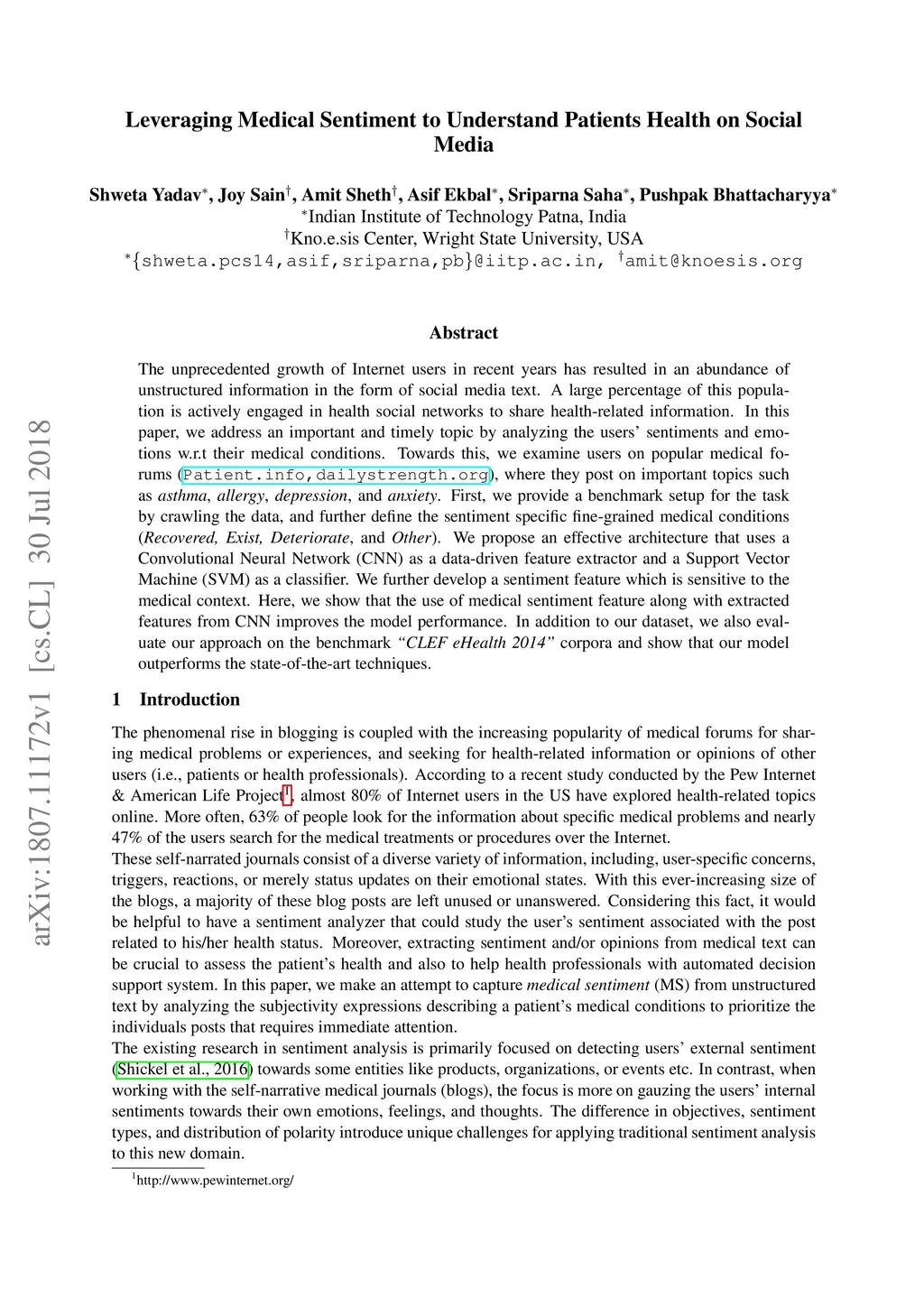 The unprecedented growth of Internet users in recent years has resulted in an abundance of unstructured information in the form of social media text. A large percentage of this population is actively engaged in health social networks to share health-related information. In this paper, we address an important and timely topic by analyzing the users' sentiments and emotions w.r.t their medical conditions. Towards this, we examine users on popular medical forums (Patient.info,dailystrength.org), where they post on important topics such as asthma, allergy, depression, and anxiety. First, we provide a benchmark setup for the task by crawling the data, and further define the sentiment specific fine-grained medical conditions (Recovered, Exist, Deteriorate, and Other). We propose an effective architecture that uses a Convolutional Neural Network (CNN) as a data-driven feature extractor and a Support Vector Machine (SVM) as a classifier. We further develop a sentiment feature which is sensitive to the medical context. Here, we show that the use of medical sentiment feature along with extracted features from CNN improves the model performance. In addition to our dataset, we also evaluate our approach on the benchmark "CLEF eHealth 2014" corpora and show that our model outperforms the state-of-the-art techniques.