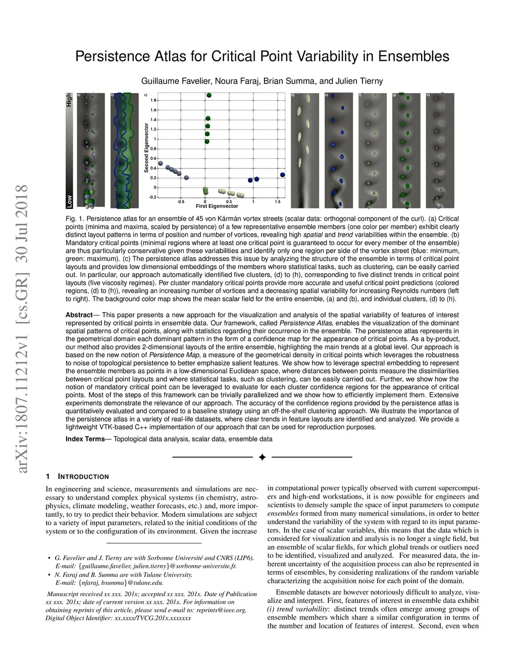 This paper presents a new approach for the visualization and analysis of the spatial variability of features of interest represented by critical points in ensemble data. Our framework, called Persistence Atlas, enables the visualization of the dominant spatial patterns of critical points, along with statistics regarding their occurrence in the ensemble. The persistence atlas represents in the geometrical domain each dominant pattern in the form of a confidence map for the appearance of critical points. As a by-product, our method also provides 2-dimensional layouts of the entire ensemble, highlighting the main trends at a global level. Our approach is based on the new notion of Persistence Map, a measure of the geometrical density in critical points which leverages the robustness to noise of topological persistence to better emphasize salient features. We show how to leverage spectral embedding to represent the ensemble members as points in a low-dimensional Euclidean space, where distances between points measure the dissimilarities between critical point layouts and where statistical tasks, such as clustering, can be easily carried out. Further, we show how the notion of mandatory critical point can be leveraged to evaluate for each cluster confidence regions for the appearance of critical points. Most of the steps of this framework can be trivially parallelized and we show how to efficiently implement them. Extensive experiments demonstrate the relevance of our approach. The accuracy of the confidence regions provided by the persistence atlas is quantitatively evaluated and compared to a baseline strategy using an off-the-shelf clustering approach. We illustrate the importance of the persistence atlas in a variety of real-life datasets, where clear trends in feature layouts are identified and analyzed.