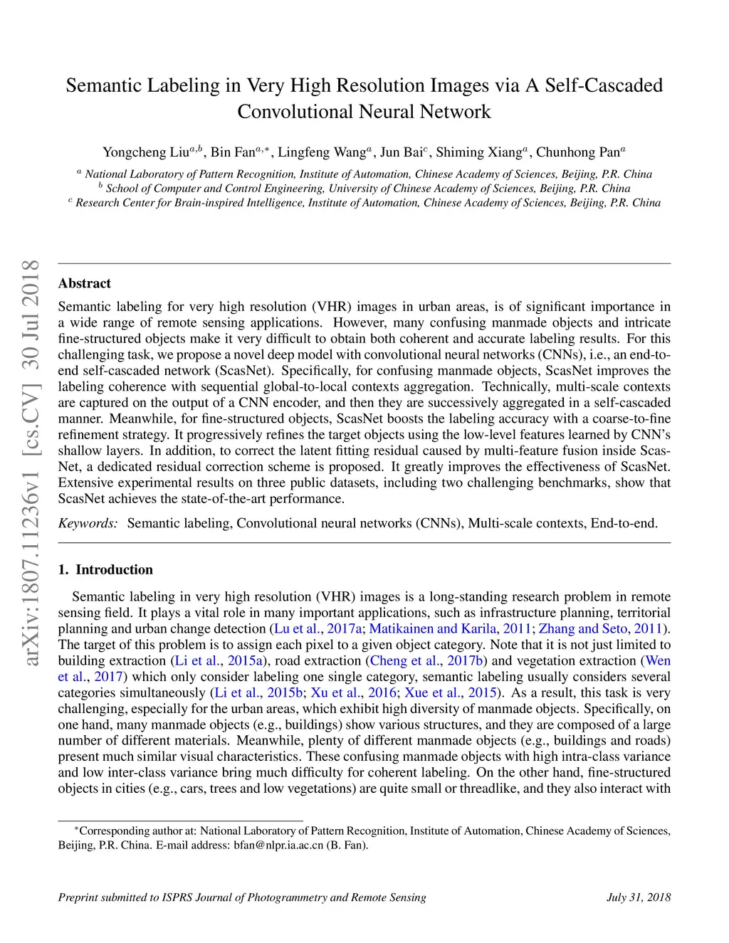 Semantic Labeling in Very High Resolution Images via a Self-Cascaded