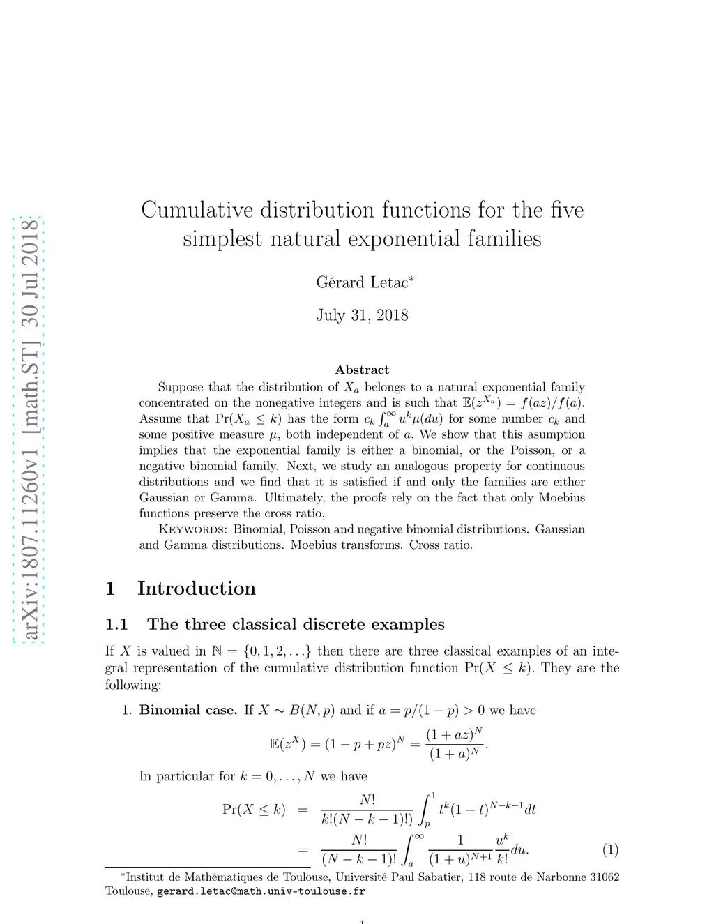 Suppose that the distribution of belongs to a natural exponential family concentrated on the nonegative integers and is such that . Assume that has the form for some number and some positive measure both independent of We show that this asumption implies that the exponential family is either a binomial, or the Poisson, or a negative binomial family. Next, we study an analogous property for continuous distributions and we find that it is satisfied if and only the families are either Gaussian or Gamma. Ultimately, the proofs rely on the fact that only Moebius functions preserve the cross ratio, \textsc{Keywords:} Binomial, Poisson and negative binomial distributions. Gaussian and Gamma distributions. Moebius transforms. Cross ratio.