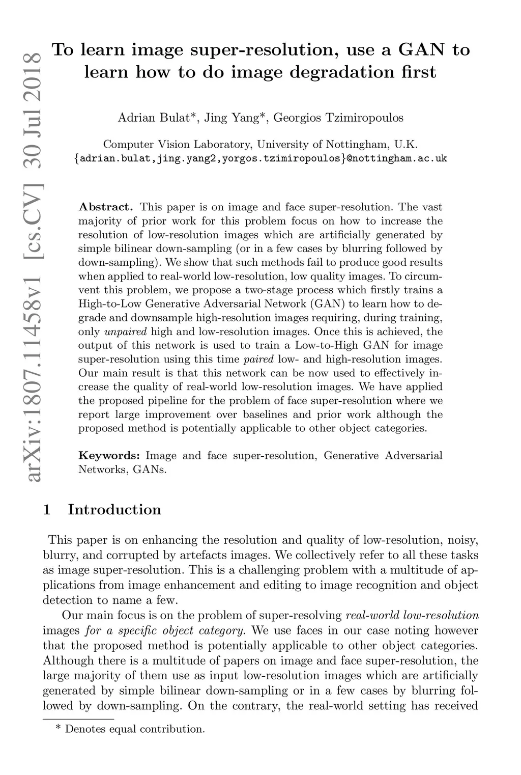 This paper is on image and face super-resolution. The vast majority of prior work for this problem focus on how to increase the resolution of low-resolution images which are artificially generated by simple bilinear down-sampling (or in a few cases by blurring followed by down-sampling).We show that such methods fail to produce good results when applied to real-world low-resolution, low quality images. To circumvent this problem, we propose a two-stage process which firstly trains a High-to-Low Generative Adversarial Network (GAN) to learn how to degrade and downsample high-resolution images requiring, during training, only unpaired high and low-resolution images. Once this is achieved, the output of this network is used to train a Low-to-High GAN for image super-resolution using this time paired low- and high-resolution images. Our main result is that this network can be now used to efectively increase the quality of real-world low-resolution images. We have applied the proposed pipeline for the problem of face super-resolution where we report large improvement over baselines and prior work although the proposed method is potentially applicable to other object categories.