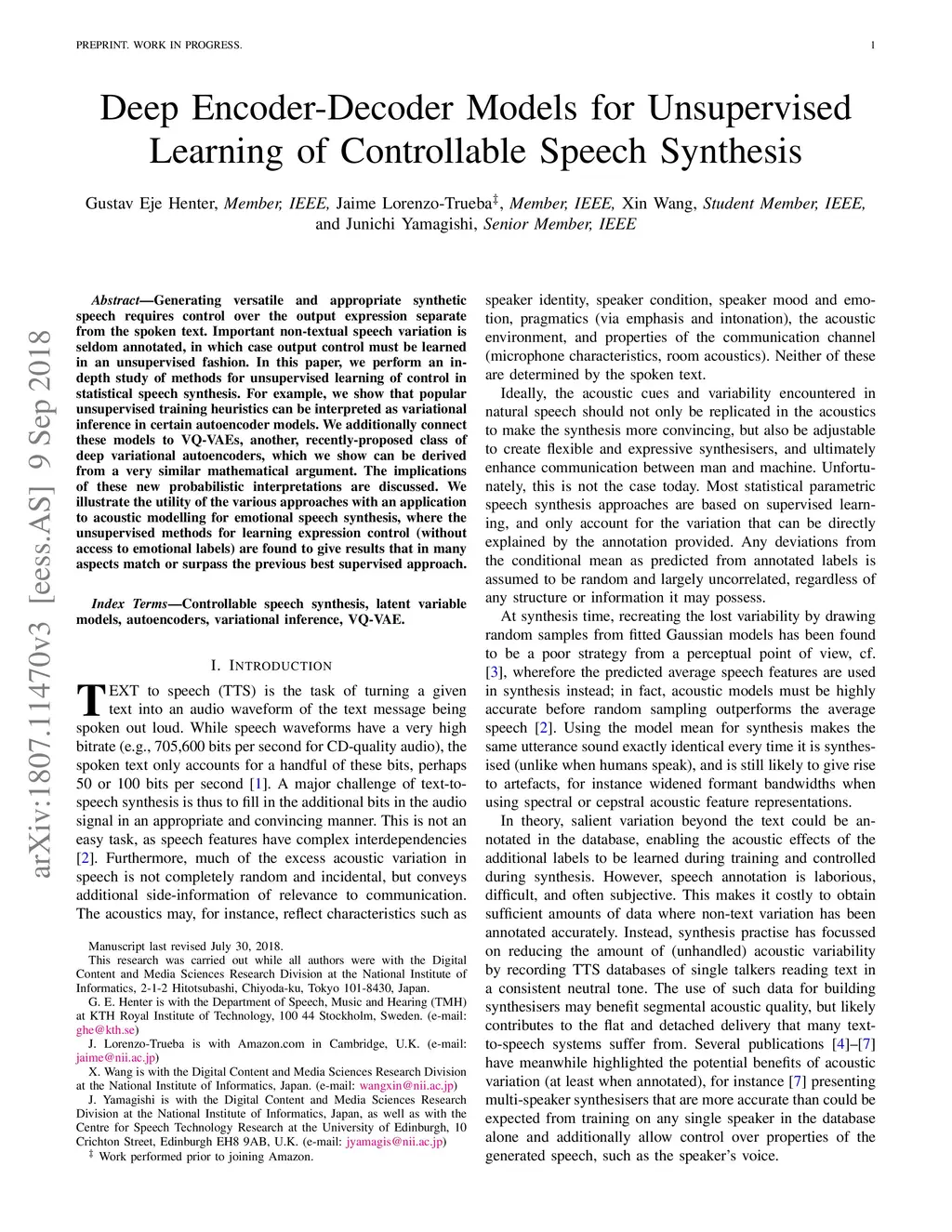 Generating versatile and appropriate synthetic speech requires control over the output expression separate from the spoken text. Important non-textual speech variation is seldom annotated, in which case output control must be learned in an unsupervised fashion. In this paper, we perform an in-depth study of methods for unsupervised learning of control in statistical speech synthesis. For example, we show that popular unsupervised training heuristics can be interpreted as variational inference in certain autoencoder models. We additionally connect these models to VQ-VAEs, another, recently-proposed class of deep variational autoencoders, which we show can be derived from a very similar mathematical argument. The implications of these new probabilistic interpretations are discussed. We illustrate the utility of the various approaches with an application to acoustic modelling for emotional speech synthesis, where the unsupervised methods for learning expression control (without access to emotional labels) are found to give results that in many aspects match or surpass the previous best supervised approach.