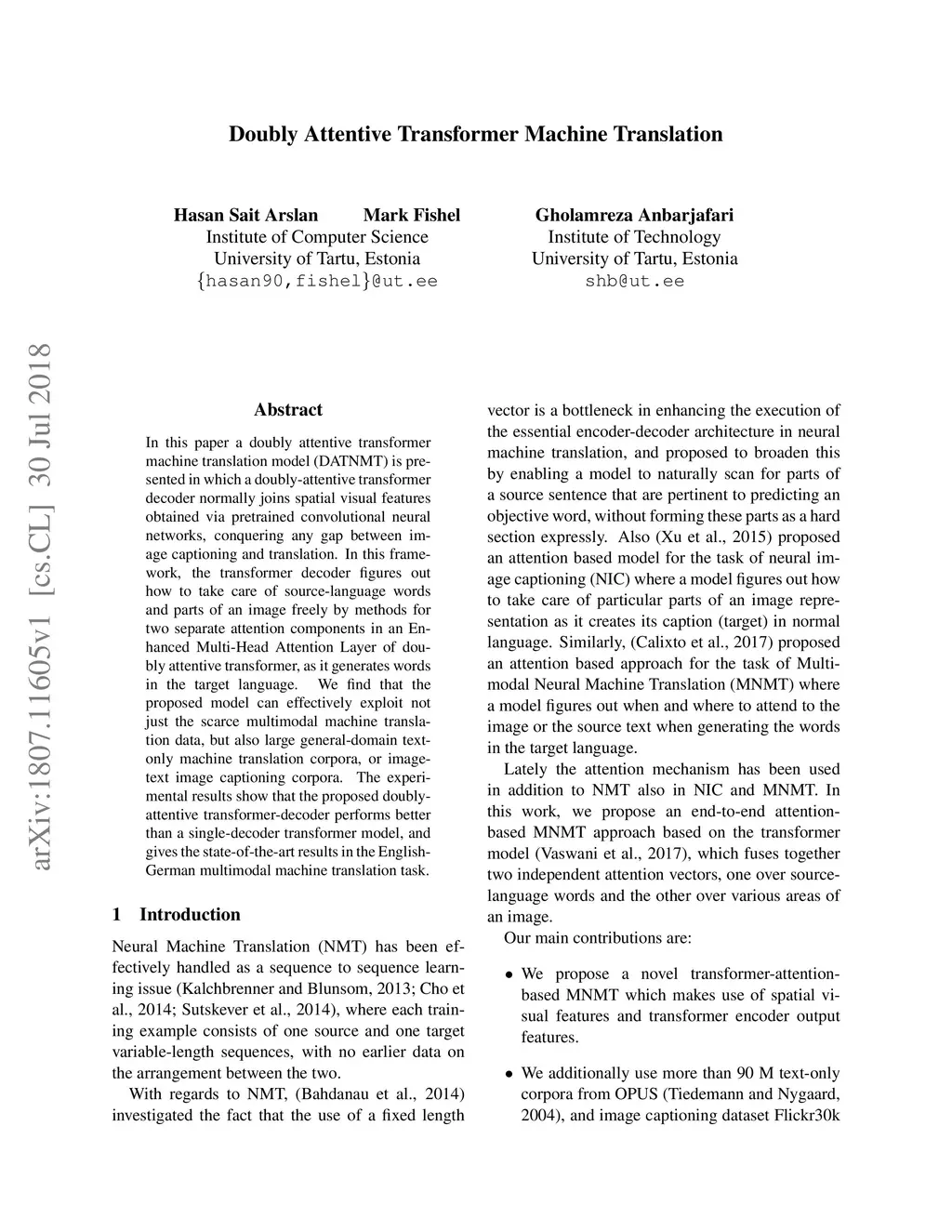 In this paper a doubly attentive transformer machine translation model (DATNMT) is presented in which a doubly-attentive transformer decoder normally joins spatial visual features obtained via pretrained convolutional neural networks, conquering any gap between image captioning and translation. In this framework, the transformer decoder figures out how to take care of source-language words and parts of an image freely by methods for two separate attention components in an Enhanced Multi-Head Attention Layer of doubly attentive transformer, as it generates words in the target language. We find that the proposed model can effectively exploit not just the scarce multimodal machine translation data, but also large general-domain text-only machine translation corpora, or image-text image captioning corpora. The experimental results show that the proposed doubly-attentive transformer-decoder performs better than a single-decoder transformer model, and gives the state-of-the-art results in the English-German multimodal machine translation task.