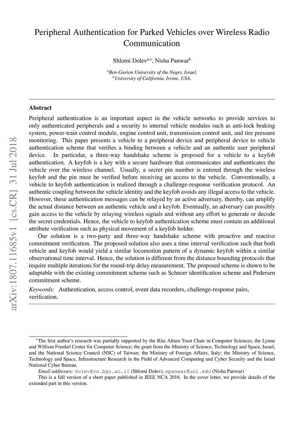 Peripheral Authentication for Parked Vehicles over Wireless Radio