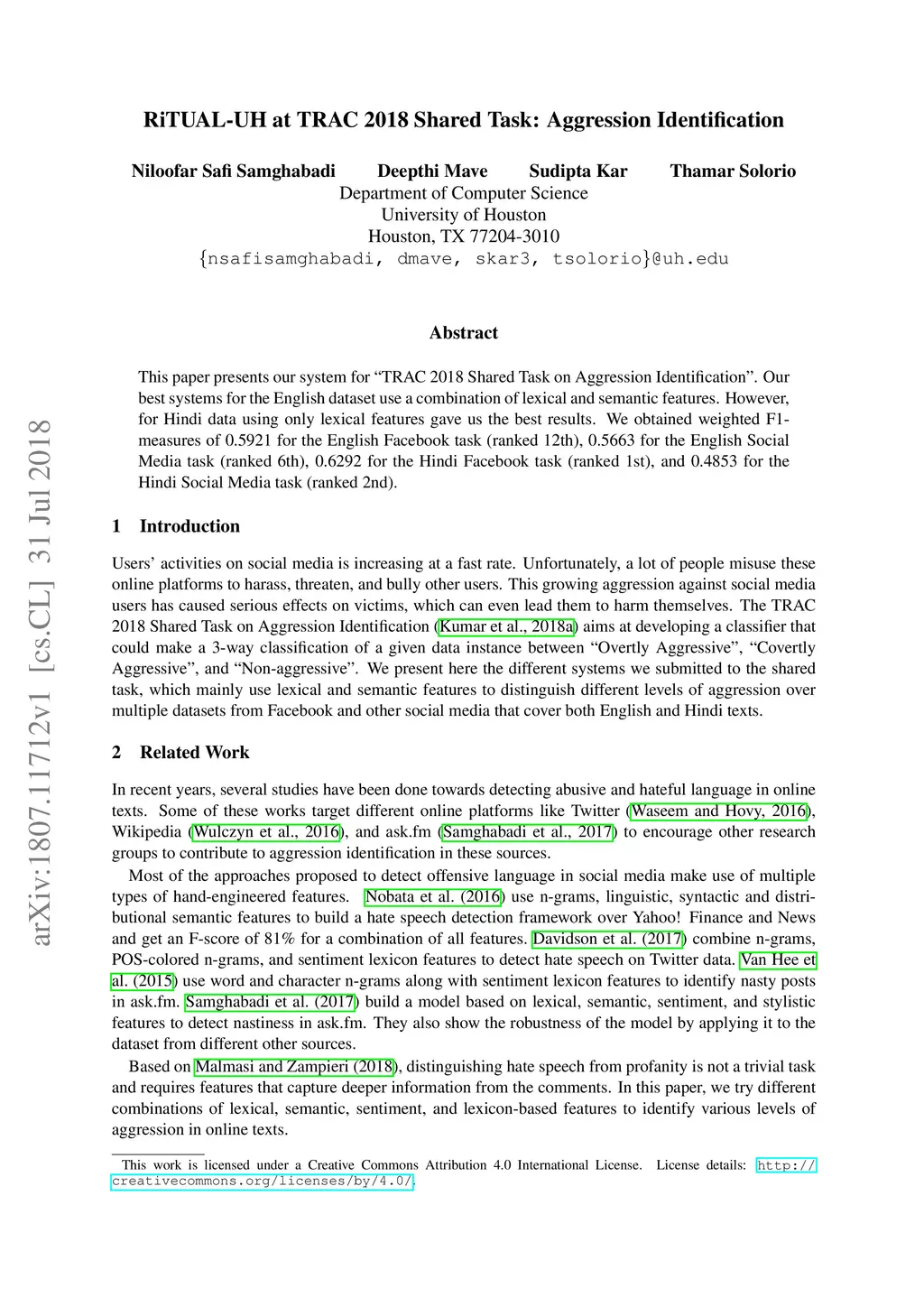 RiTUAL-UH at TRAC 2018 Shared Task: Aggression Identification