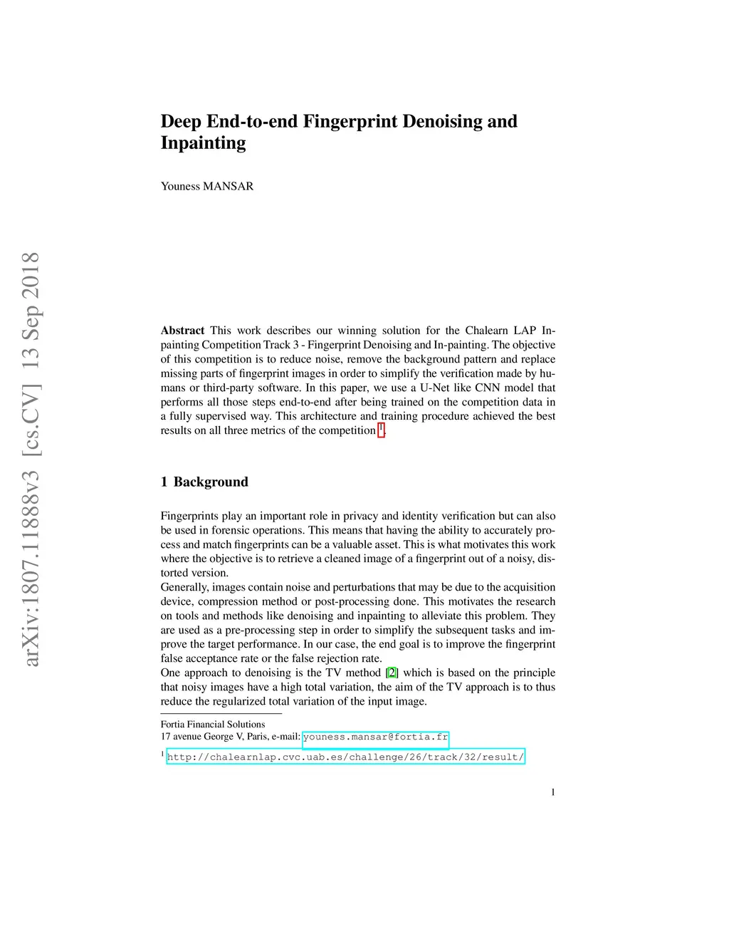 This work describes our winning solution for the Chalearn LAP In-painting Competition Track 3 - Fingerprint Denoising and In-painting. The objective of this competition is to reduce noise, remove the background pattern and replace missing parts of fingerprint images in order to simplify the verification made by humans or third-party software. In this paper, we use a U-Net like CNN model that performs all those steps end-to-end after being trained on the competition data in a fully supervised way. This architecture and training procedure achieved the best results on all three metrics of the competition.
