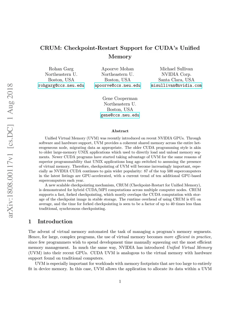CRUM: Checkpoint-Restart Support for CUDA's Unified Memory