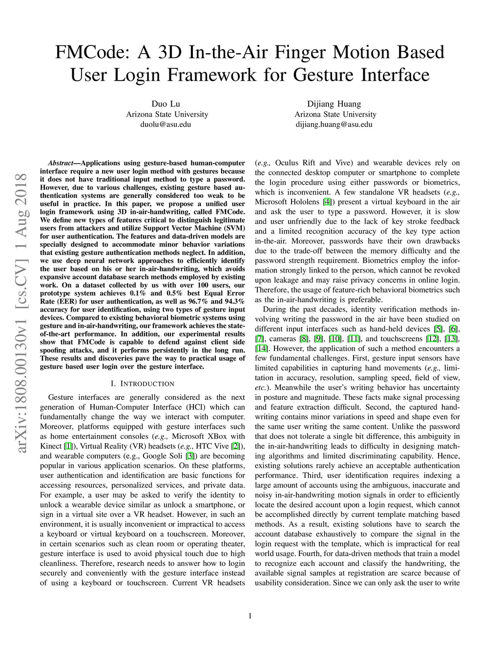 FMCode: A 3D In-the-Air Finger Motion Based User Login Framework for