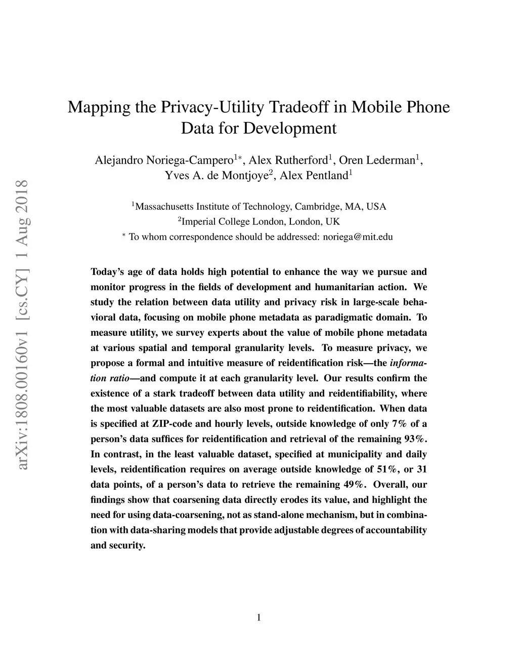 Today's age of data holds high potential to enhance the way we pursue and monitor progress in the fields of development and humanitarian action. We study the relation between data utility and privacy risk in large-scale behavioral data, focusing on mobile phone metadata as paradigmatic domain. To measure utility, we survey experts about the value of mobile phone metadata at various spatial and temporal granularity levels. To measure privacy, we propose a formal and intuitive measure of reidentification riskthe information ratioand compute it at each granularity level. Our results confirm the existence of a stark tradeoff between data utility and reidentifiability, where the most valuable datasets are also most prone to reidentification. When data is specified at ZIP-code and hourly levels, outside knowledge of only 7% of a person's data suffices for reidentification and retrieval of the remaining 93%. In contrast, in the least valuable dataset, specified at municipality and daily levels, reidentification requires on average outside knowledge of 51%, or 31 data points, of a person's data to retrieve the remaining 49%. Overall, our findings show that coarsening data directly erodes its value, and highlight the need for using data-coarsening, not as stand-alone mechanism, but in combination with data-sharing models that provide adjustable degrees of accountability and security.