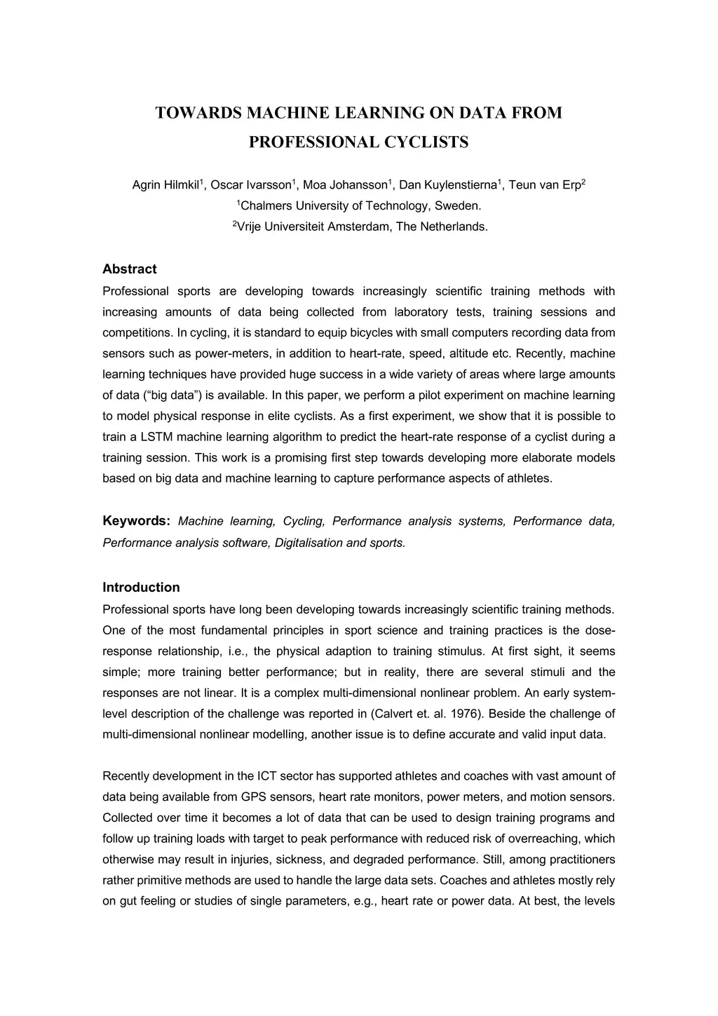 Professional sports are developing towards increasingly scientific training methods with increasing amounts of data being collected from laboratory tests, training sessions and competitions. In cycling, it is standard to equip bicycles with small computers recording data from sensors such as power-meters, in addition to heart-rate, speed, altitude etc. Recently, machine learning techniques have provided huge success in a wide variety of areas where large amounts of data (big data) is available. In this paper, we perform a pilot experiment on machine learning to model physical response in elite cyclists. As a first experiment, we show that it is possible to train a LSTM machine learning algorithm to predict the heart-rate response of a cyclist during a training session. This work is a promising first step towards developing more elaborate models based on big data and machine learning to capture performance aspects of athletes.